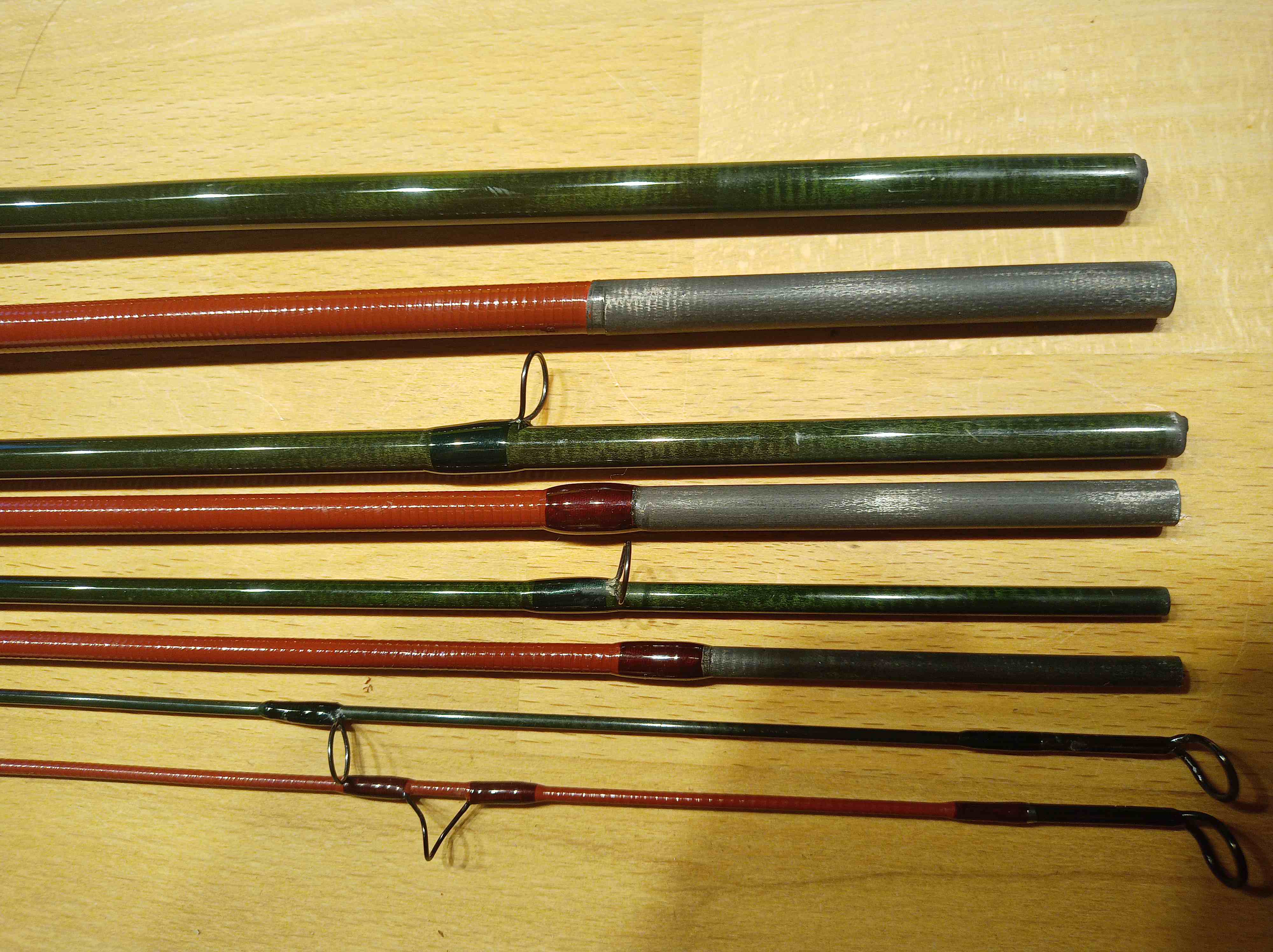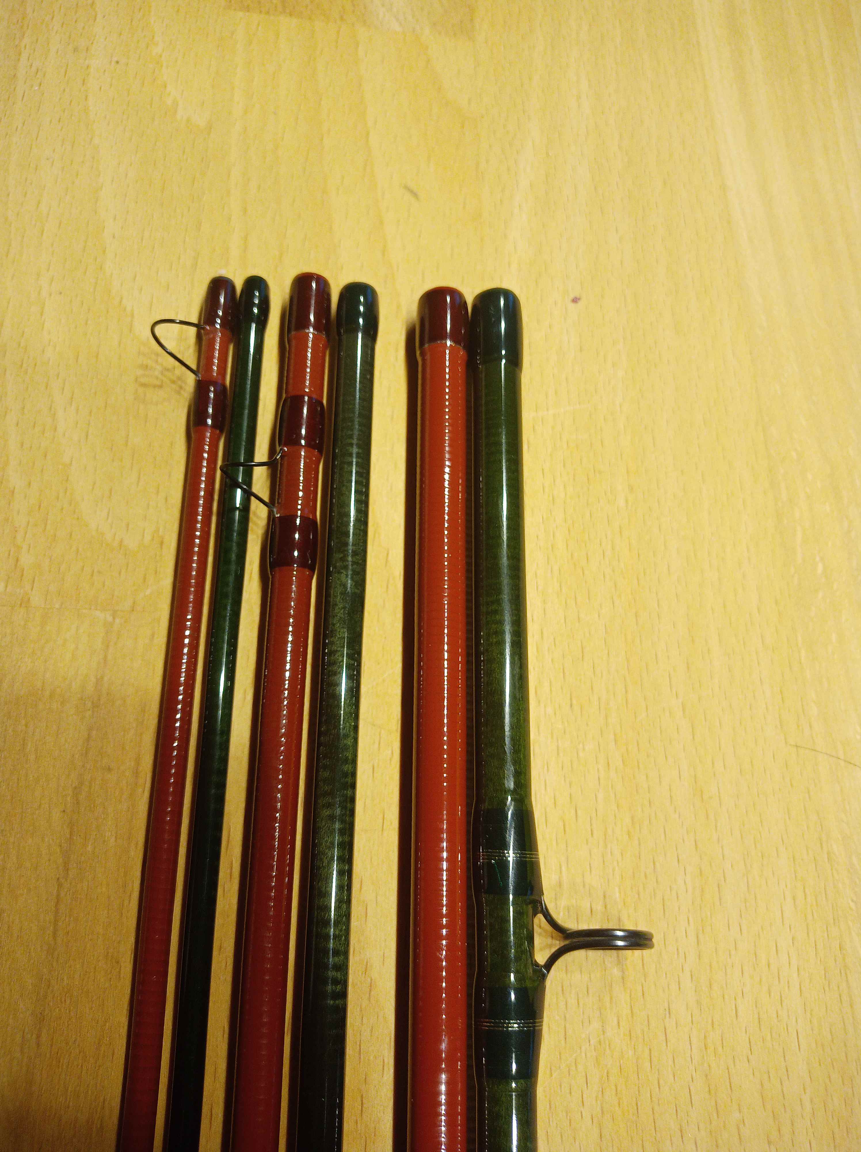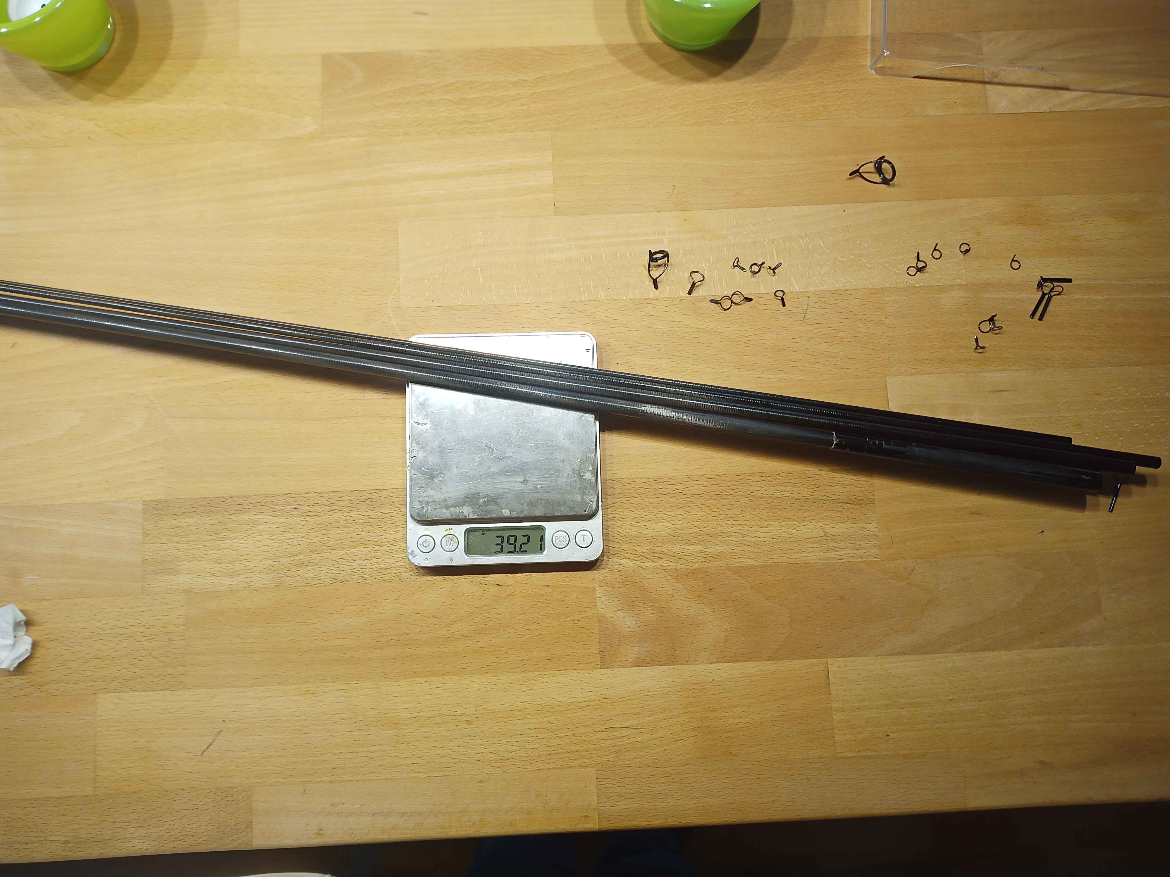 Ich habe leider nicht alle Teile einzeln gewogen. Reiner Blanklack sind am Teil nach dem HT etwa 0,6g entfernt worden. Die beiden vorderen Teile habe ich leider nicht einzeln gewogen, nachdem ich die Ringe entfernt hatte. ich denke die Farbe des gesamten Blanks wird etwa auf 2g gekommen sein. Insgesamt sind etwa 4g an Rutenlack, Garn und Ringlackierungen runtergekommen. Die Schlangenringe wiegen zusammen 0,93g. Der Minima Leitring (übrigens sehr gut gearbeitet mit einer sauber verpressten Einlage) ist mit 1,04g dabei und der Spitzenring mit 0,4g.
