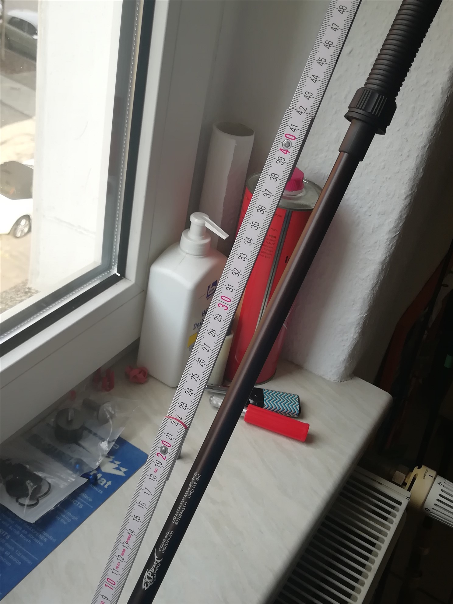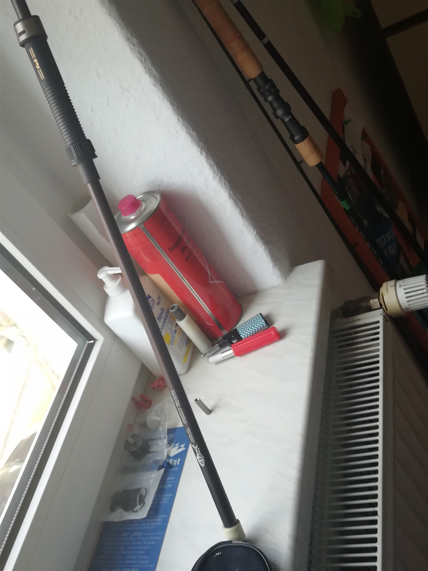 - zweiteiliger Spinnblank, der wohl auch bei RST produziert wurde, zweiteilig 3m lang bordeaux farben, erstaunlich leicht, für einen Blank älterer Konstruktion.