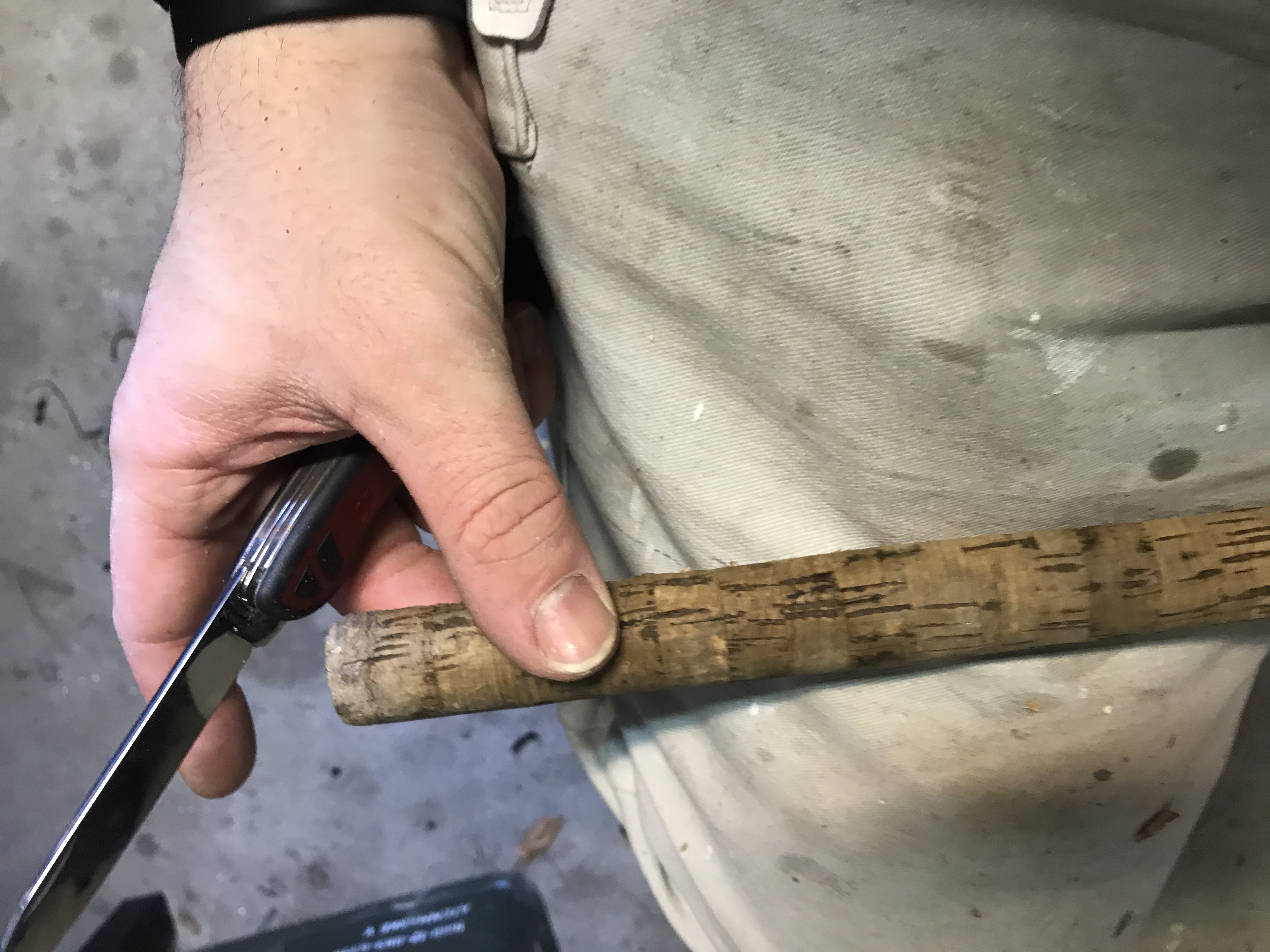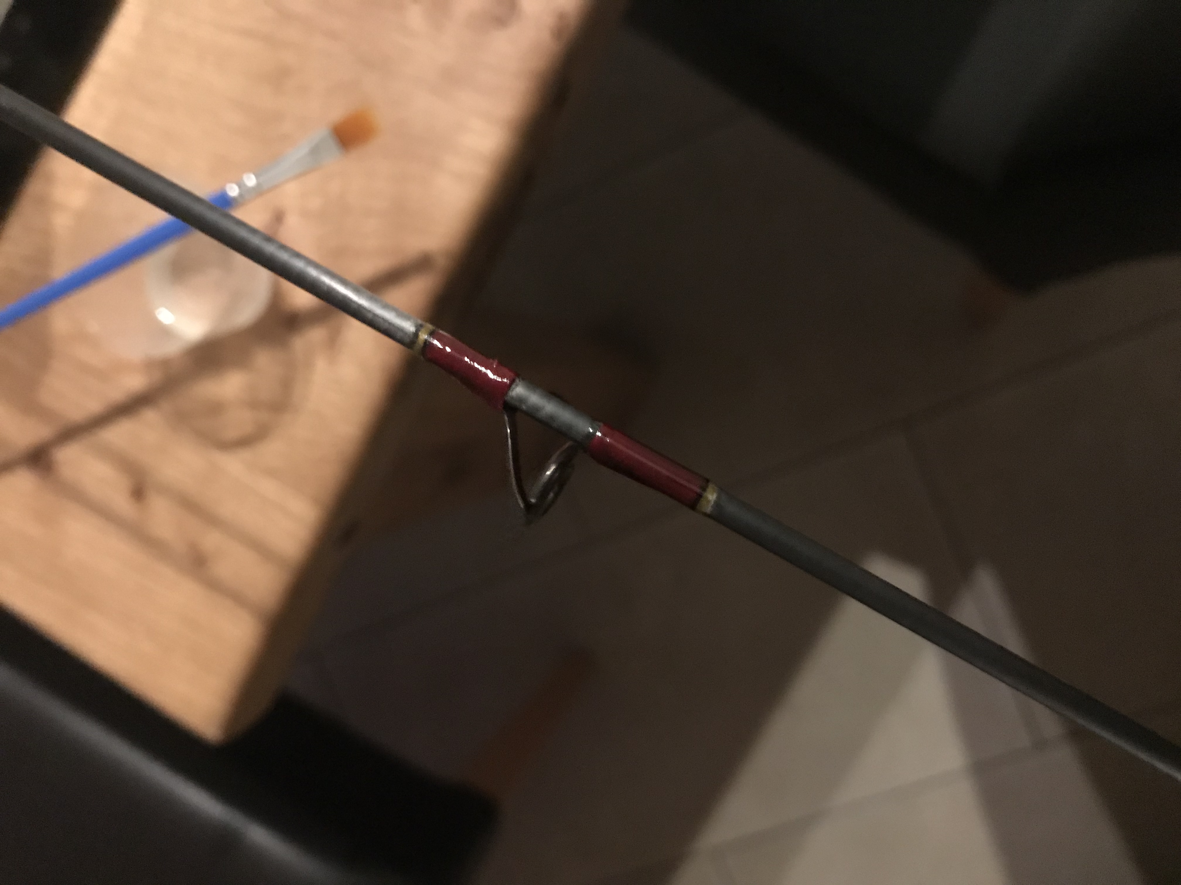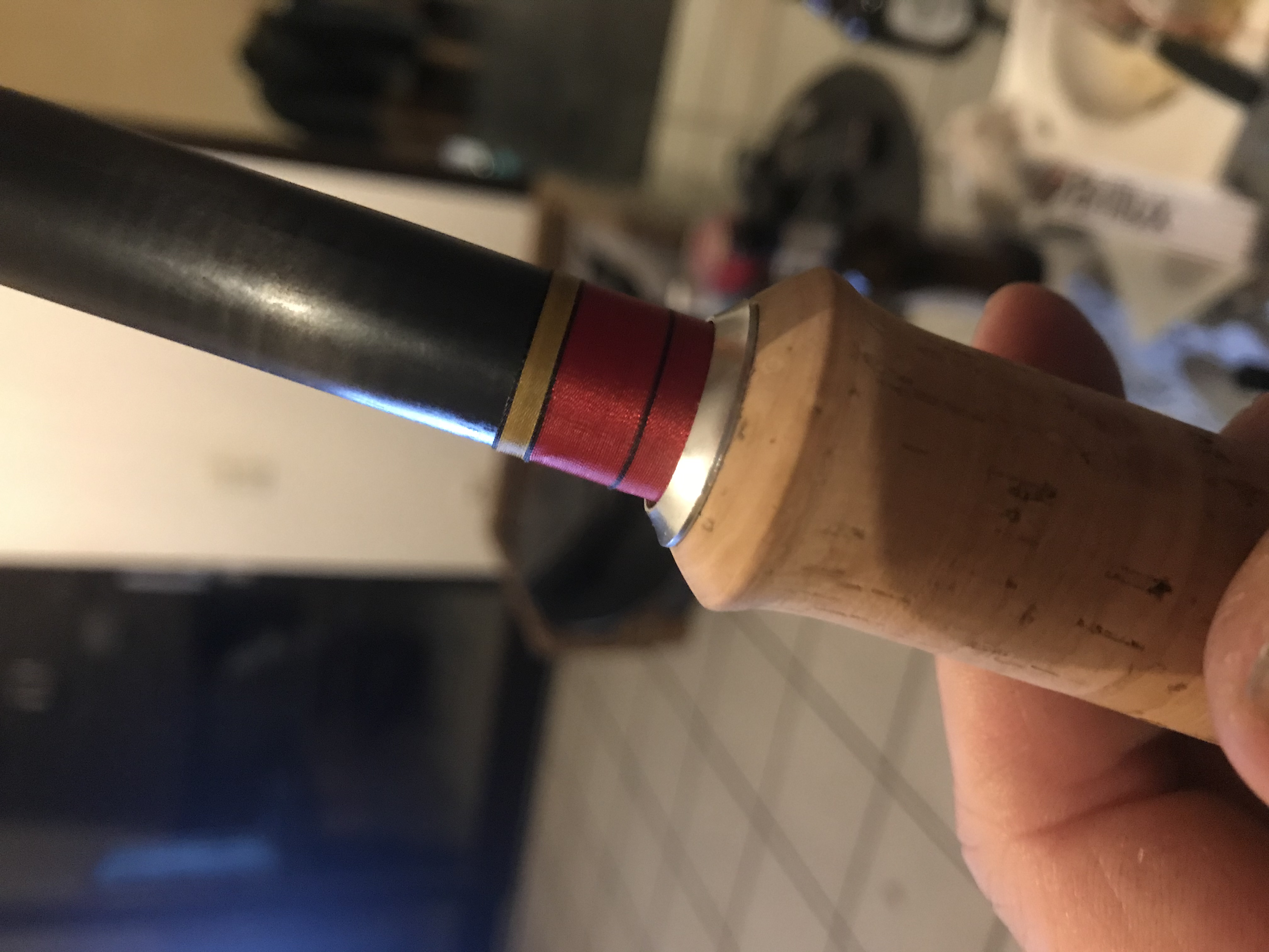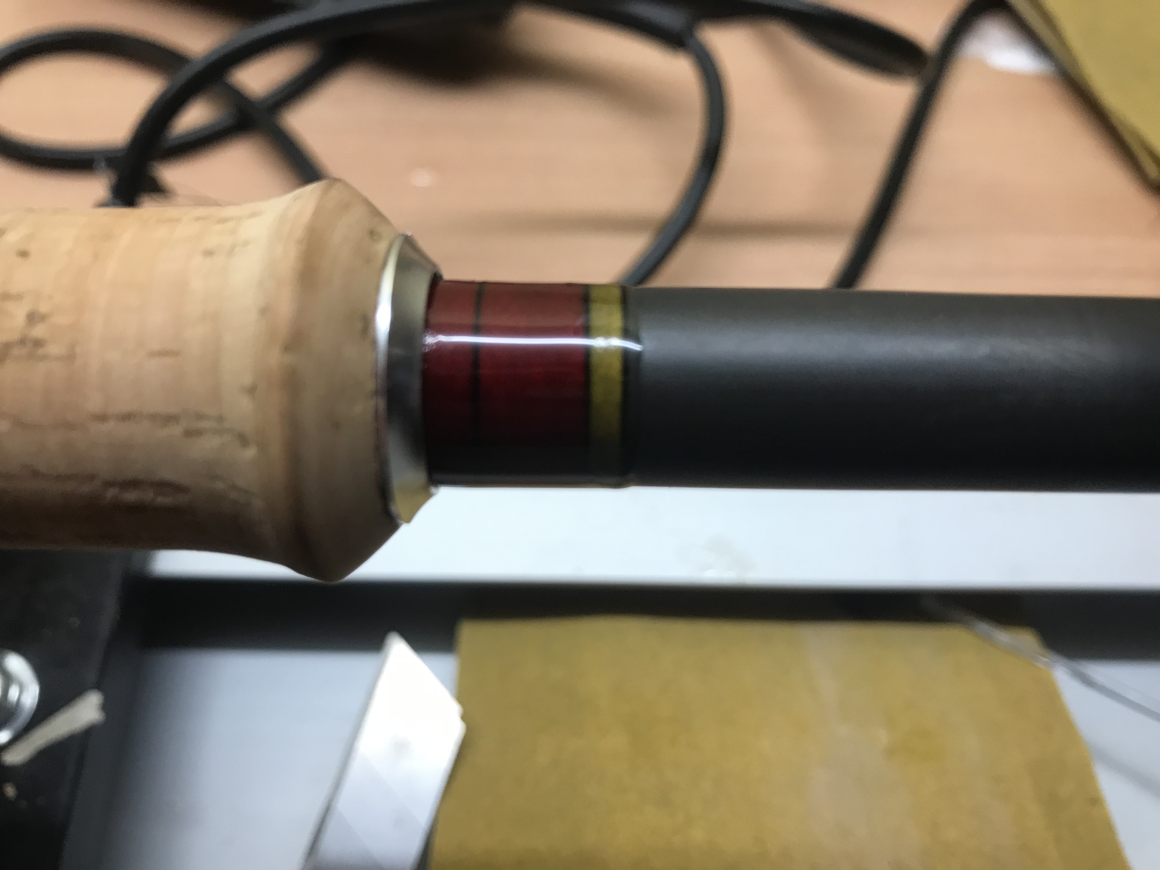 Ich hab mich dazu entschlossen den Blank komplett neu aufzubauen. Neuer Korkgriff und die Ringe neu wickeln. Da der original Lack extrem gelitten hat musste da auch was passieren, also hab ich diesen komplett abgeschliffen und mit PU-Leim behandelt.