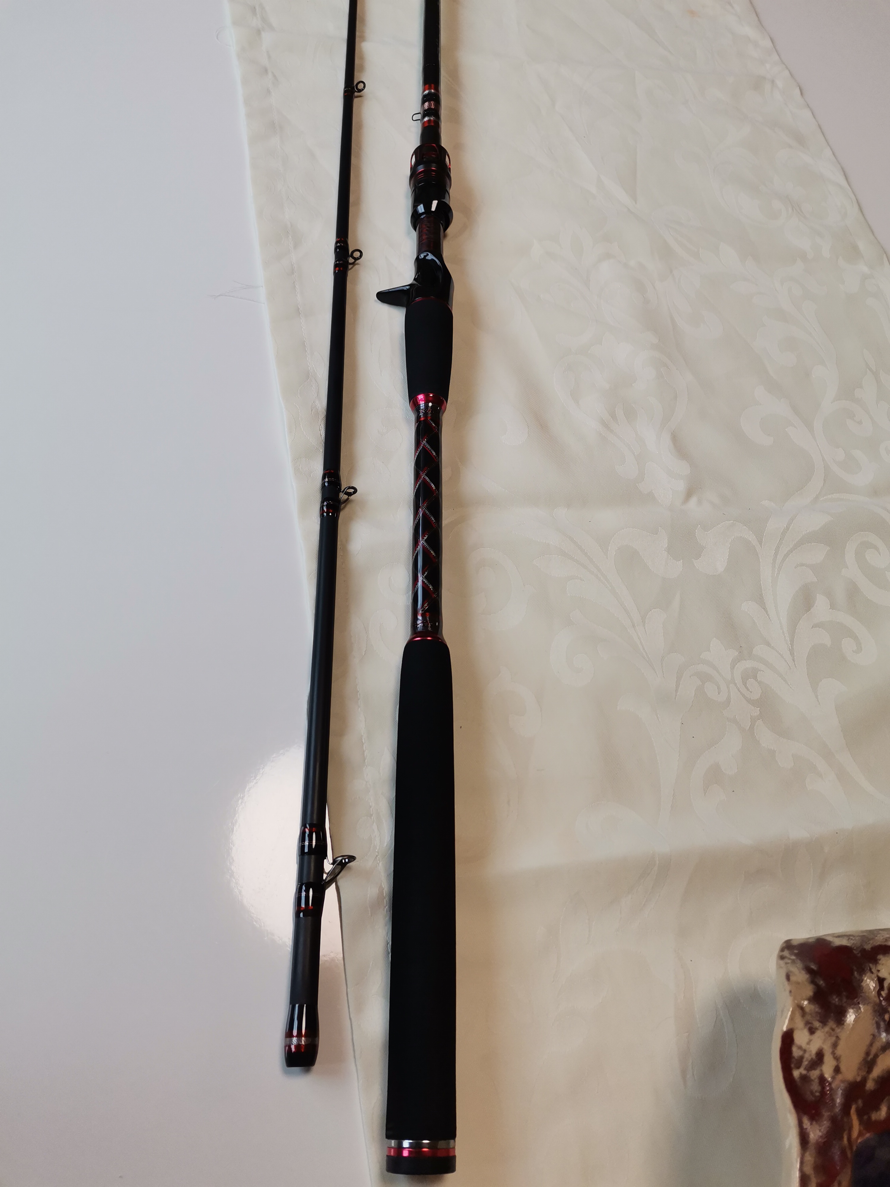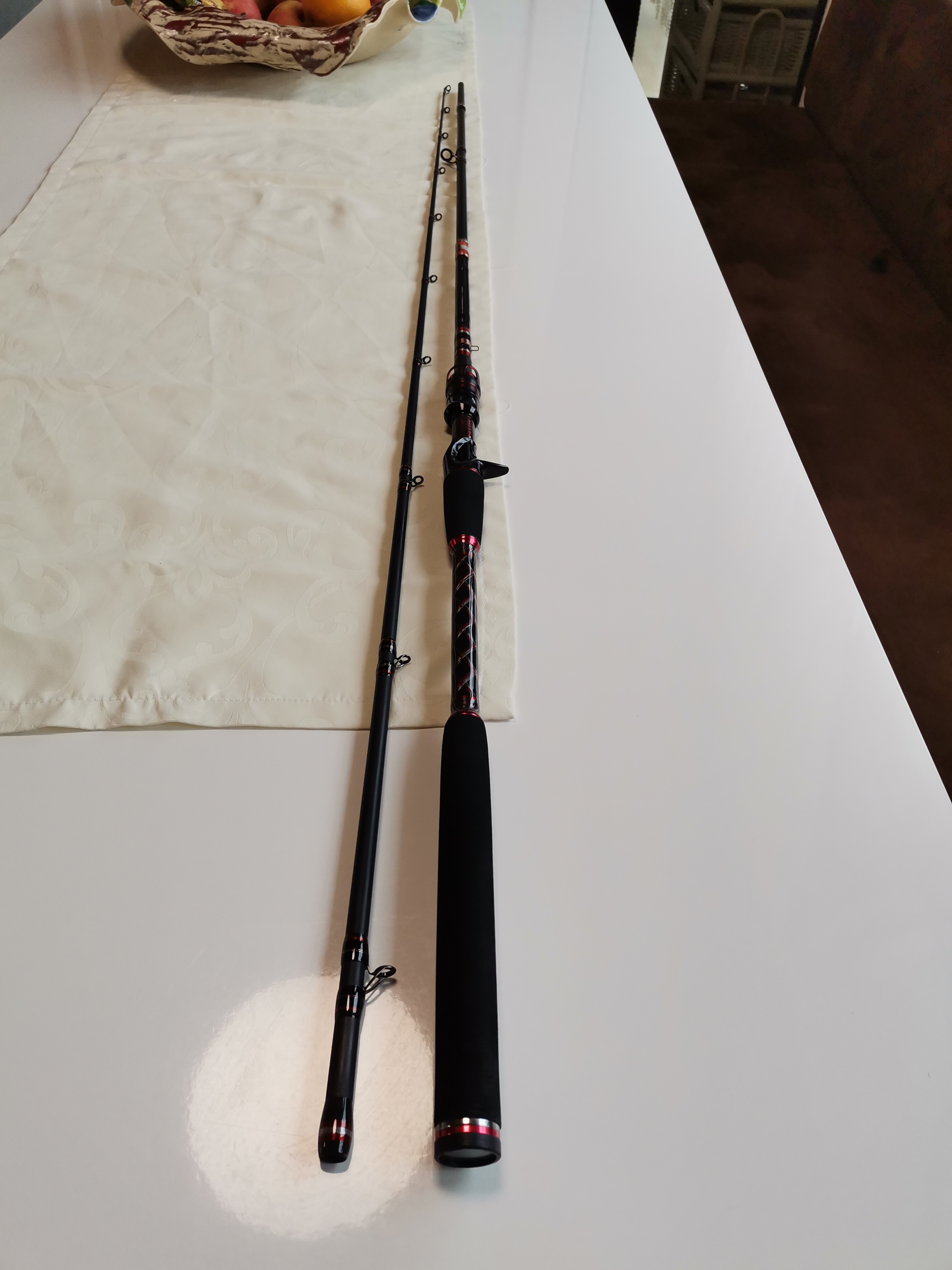 pDie Baitcaster umgebaut aus einer komplett gestrippten Senshu Skin & Bone Special Shad Casting 2,40m 2 tlg 40-110g, für die Hechtfischerei in den heimischen Gewässern. Die Originalversion war für meinen Geschmack furchtbar aufgebaut, der Blank an sich fühlte sich nicht so schlecht an und wars mir einen Versuch wert. Griff/RH aus Chinaproduktion (Ebay glaub ich...) plus ein paar Kleinigkeiten vom Dieter. 11 Fuji SIC Ringe 12-6 und 6 Top bei einer Länge von 2,42 m. Der nackte Blank schaute entsetzlich aus und müsste radikal geschliffen werden, die Lackierung stellte sich danach in der Praxis als unmöglich zu bewerkstelligen . Glatte Lackierung keine Chance, die Blasenbildung war ein Horror, auch nach einer Trocknungszeit von zwei Tagen (nach Schleifen/Entfetten, etc...)
