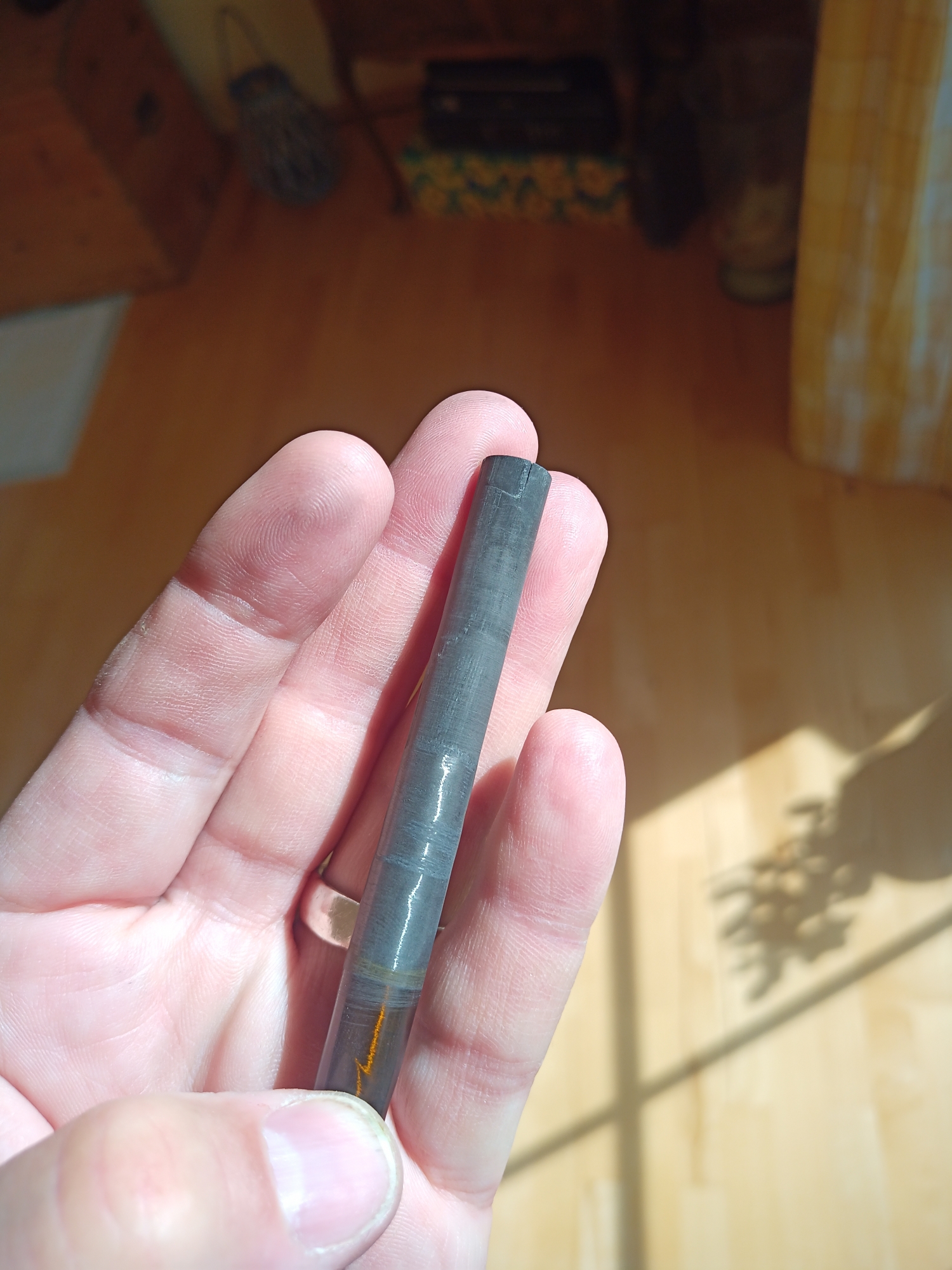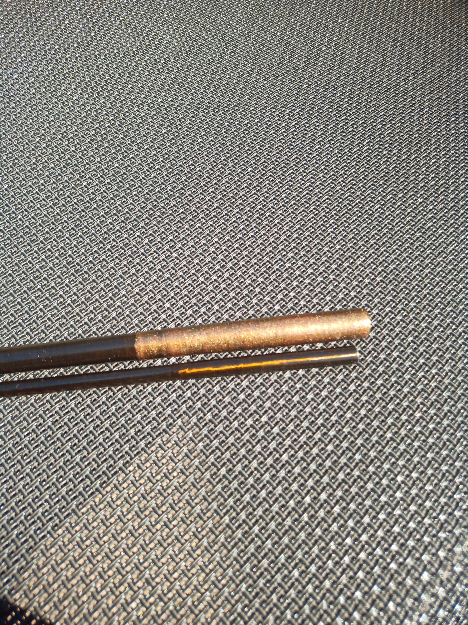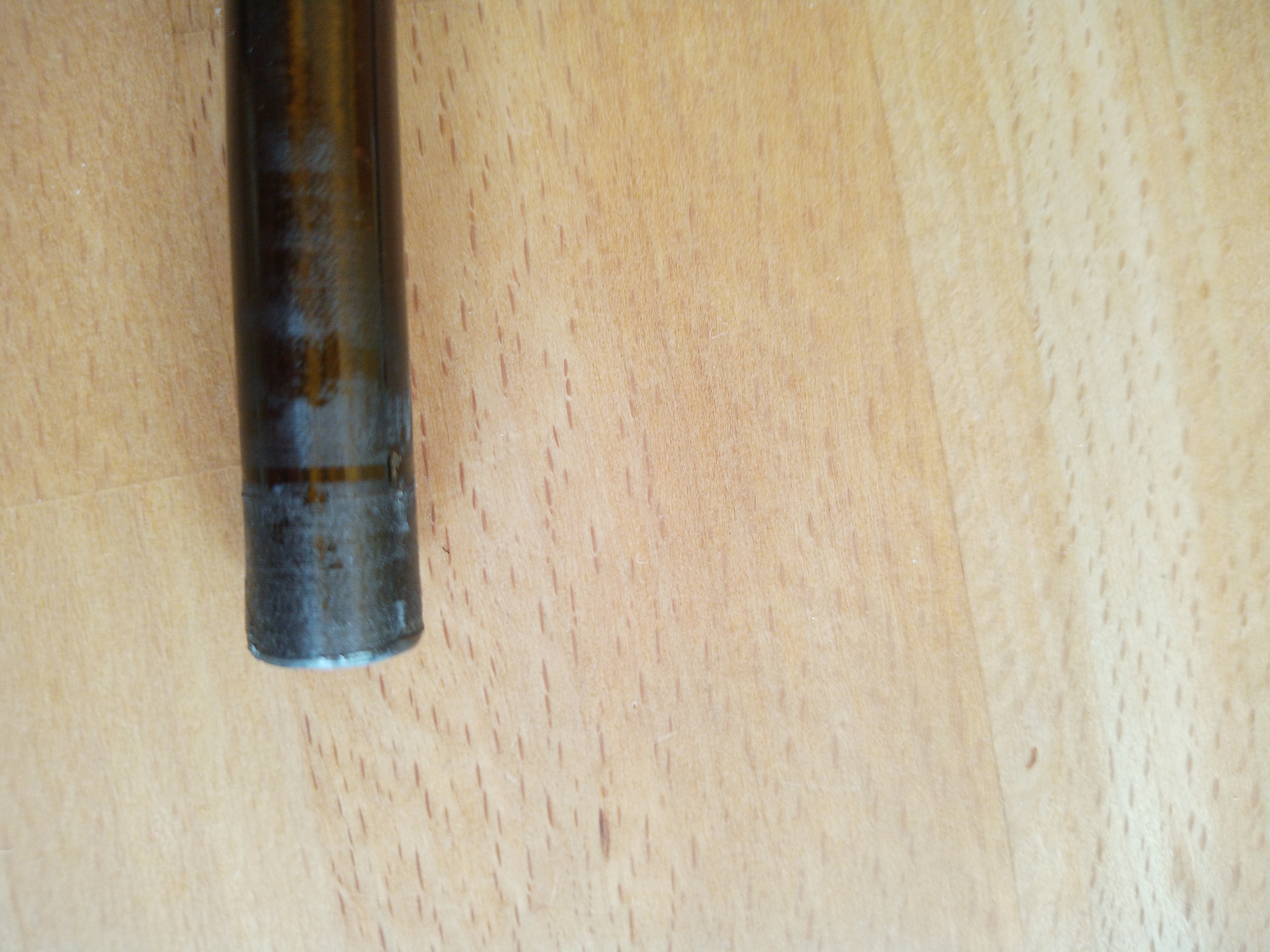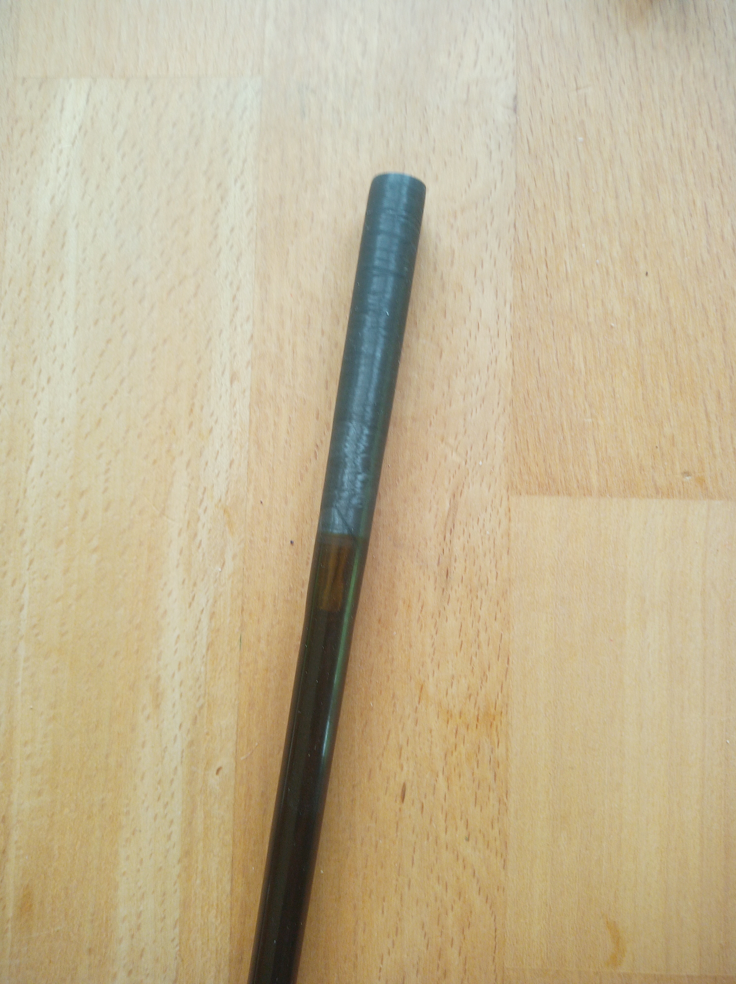 Da der Blank in der Stärke sehr kräftig ausfällt, trage ich mich mit dem Gedanken eine Spinnrute aus ihm zu machen. Der Rollenhalter passt auch für Spinnrollen und durch den Vorgriff bliebe sogar die Aufschrift erhalten. Da die Wandstärke echt kräftig ist, kann ich mir vorstellen, dass sie auch echte 25g wirft. Aber erstmal muss die Hülse repariert werden, und möglichst so, dass es nicht nur hält, sondern auch gut aussieht. Und dann entscheide ich, ob sie eine Fliegenrute wird oder zur dunklen Seite wechselt.