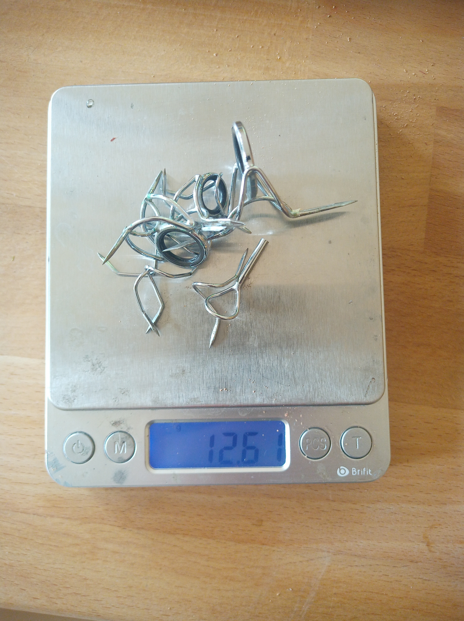 Probewerfen habe ich auch schon hinter mir. Bei der Kombi war eine gute Schnur mit sehr geringer Dehnung und 24,5g auf etwa 12m Keule. Die Rute kann weit mehr ab, die Schnur geht aber ganz schön ab. Die Rute spricht auch schon mit wenigen Metern an und hat Power ohne Ende. Gefällt mir richtig gut, wenn das Gewicht nicht wäre. Rute (212g) mit Rolle und Schnur (513g) wiegen bummelige 725 Gramm. Das kann man machen, wenn man nur gespottete Monsterfische anwirft. Aber selbst mit einer leichteren Rolle wäre mir das zu schwer, also habe ich sie schon mal weitgehend gestrippt. Nur der Griff und der Vorgriff sind draufgeblieben. Insgesamt sind mit Ringen und Anbauteilen fast 90 Gramm runtergekommen.