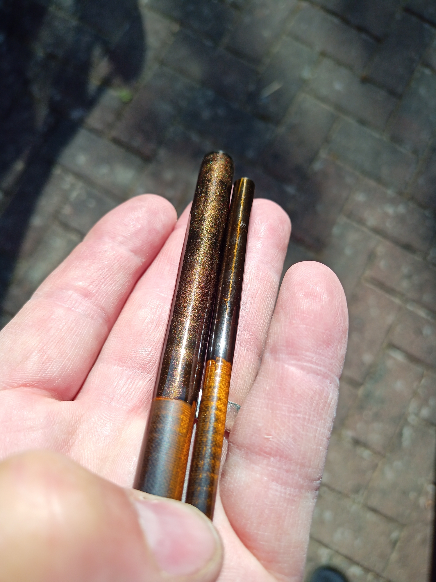 Beim dritten Mal kam mir dann der Gedanke deutlich weniger Pigment in den Rutenbaulack zu rühren, damit die Rovingstruktur, wie im Original, noch ein wenig durchscheint und das Ganze dunkler werden lässt. Ich habe dann auch nur das einfache Braun genommen und den Lack noch etwas mehr verdünnt. (10 Tropfen auf 2ml angerührten Lack)