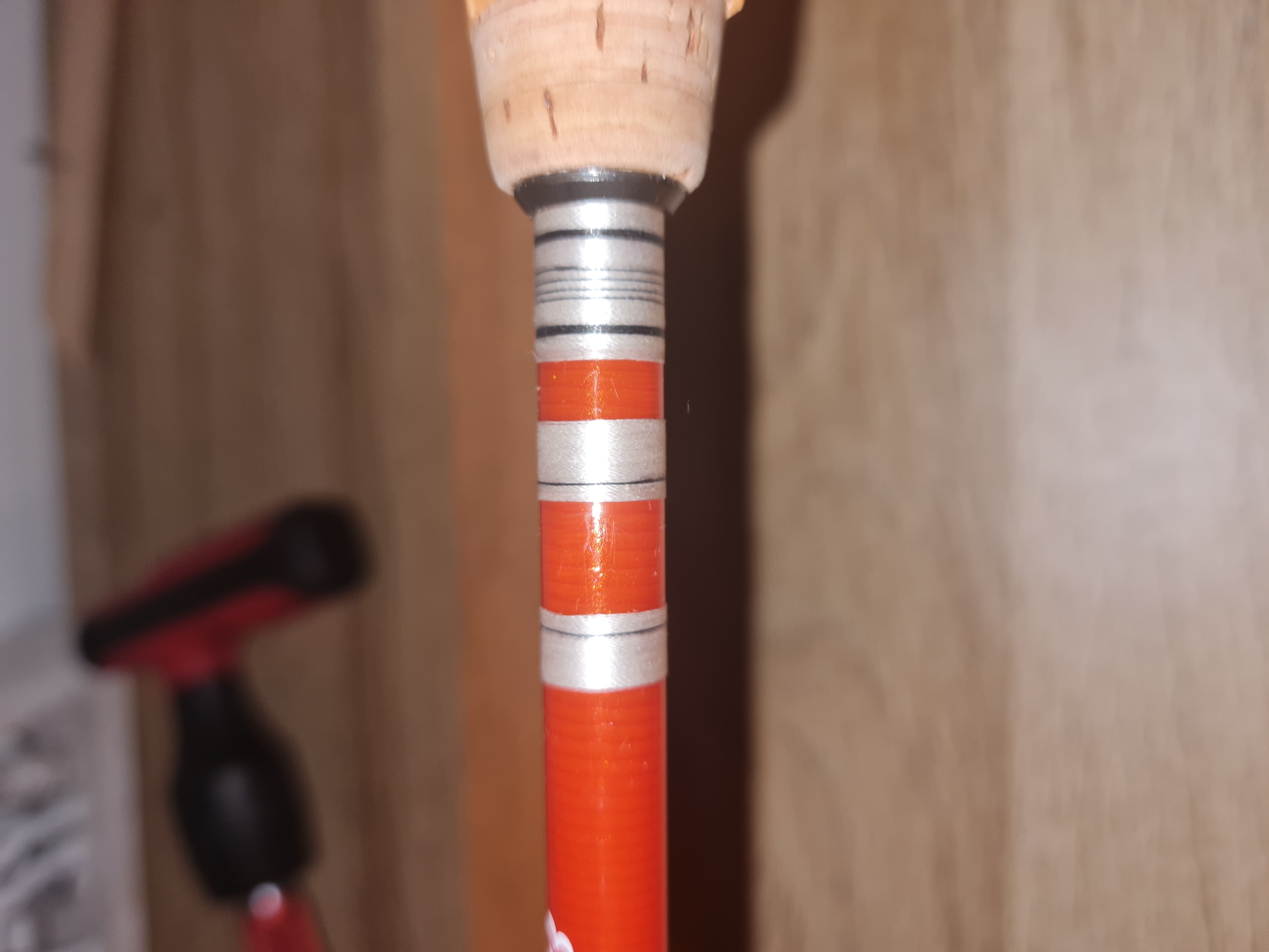 sehr schön aufgebaute Rute, sieht man nicht, dass es die Erste ist. Auch der Griff sieht sieht gut aus, finde ich. Ist der selbst aus Scheiben gemacht ?