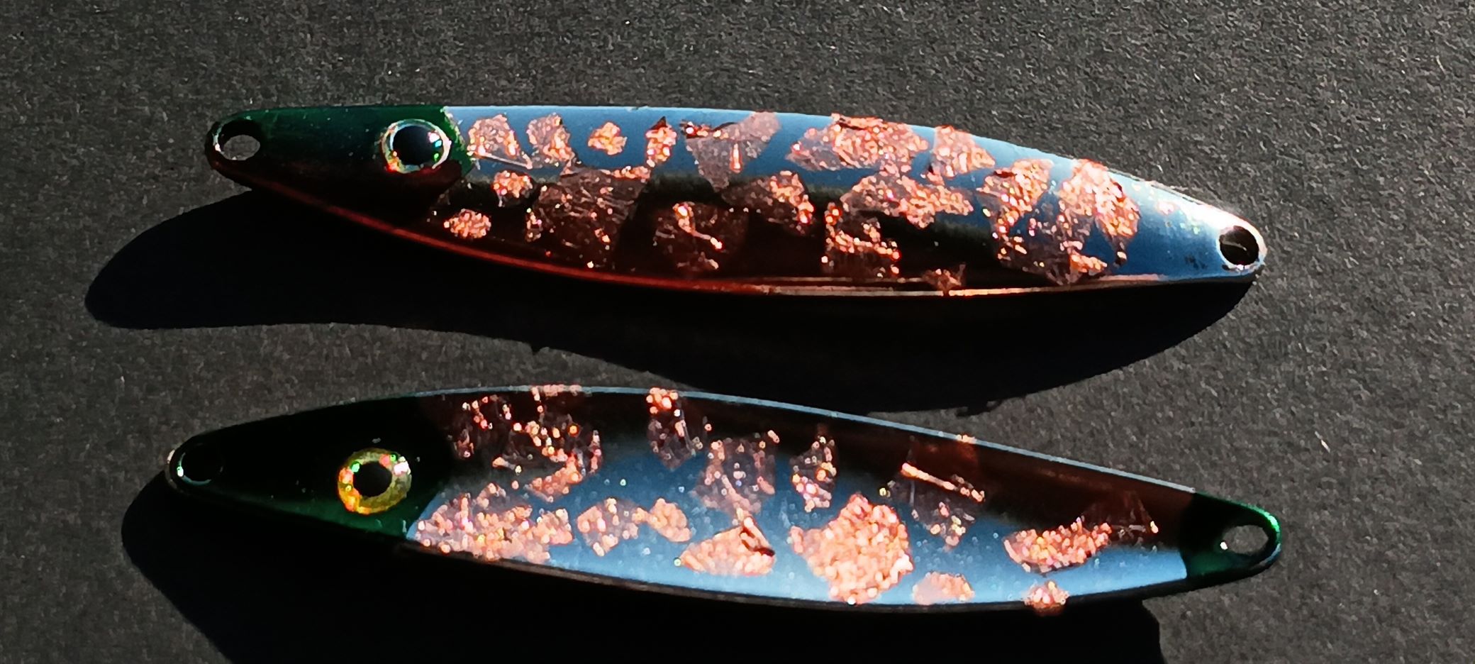 Wieder 16g Standard Blinker Entlackt, immer einen Halben cm mit Zaponlack eingestrichen und Stückchen vom Blatt Kupfer daraufgelegt, leider nur Kupfer da sie mir zweimal Kupfer geschickt haben , anstatt 1 Kupfer und 1 mal Gold.