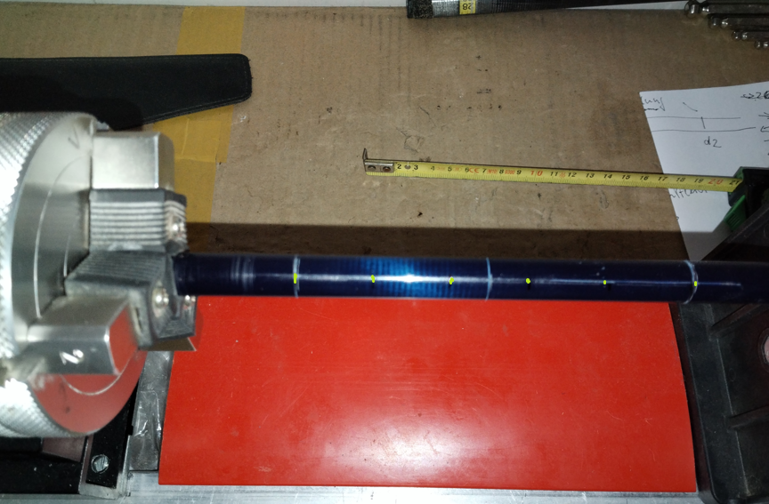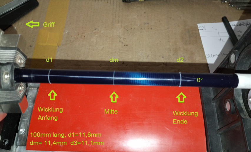 Los geht es. Mein sichtbarer Wicklungsbereich soll ca 150mm lang werden und ich habe etwa 30mm an den Enden zusätzlich für die Überwicklung vorgesehen.