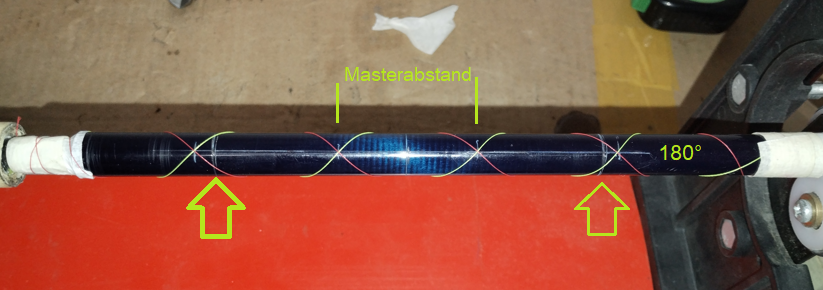 Hier allerdings unterteile ich den Masterabstand vorerst nicht weiter und wickle erst nur auf 2 Achsen (0° und 180°), behalte mir aber später die Option offen, dazwischen weitere Muster zu wickeln (dann enstünden 2 weitere Achsen) oder die Zwischenräume offen zu lassen oder die Zwischenräume einfarbig zu zu wickeln oder mit Bändern oder ähnliches. Ich will erst mal sehen, ob das erste Muster gelingt. Das ist ja auch nicht gesagt, dass das immer so passt.