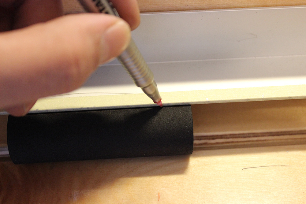 3. Jetzt auf beiden Stücken eine gerade Linie ziehen. Die braucht ihr damit der Ausschnitt später auch gerade am neuen Griff sitzt. Ich benutze dafür eine Anzeichenhilfe für Kreuzwicklungen.