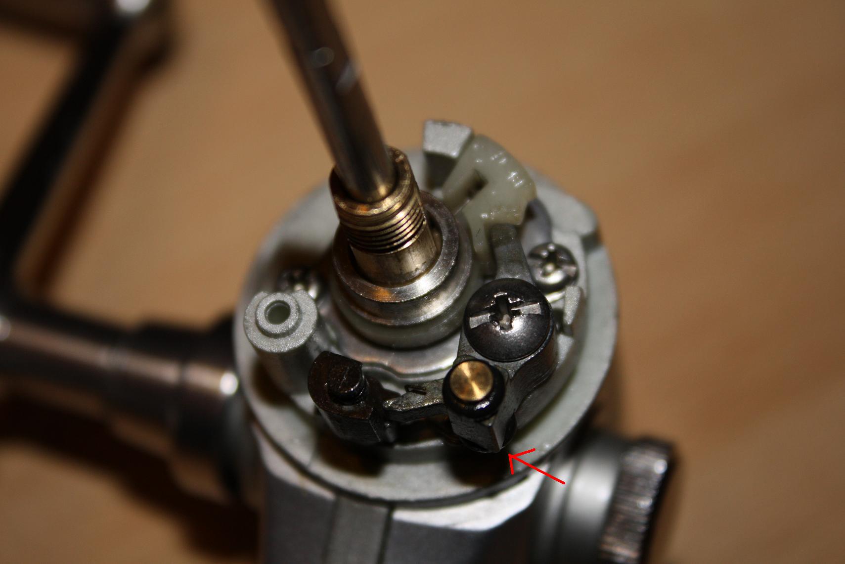 hole das thema nochmal hervor. vielleicht hab ich eine lösung. ich glaube das problem auch schon mal an einer meiner alten rollen gehabt zu haben. dabei war die schraube, welche "das teil mit dem roten Pfeil" fixiert, zu fest angezogen. mMn muß "das teil" locker auf dem gewindestift sitzen.