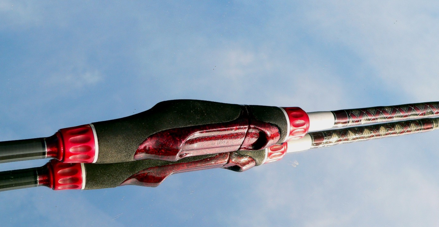 Als RH dient ein Fuji ACS mit KDPS-Gewindeteil. Eingefasst von Zierringen aus Alu in Rot und Titan. Der Vorgriff gleitet auf einer polierten V2A Hülse. Beim Griffmaterial habe ich auf Korklon zurückgegriffen.