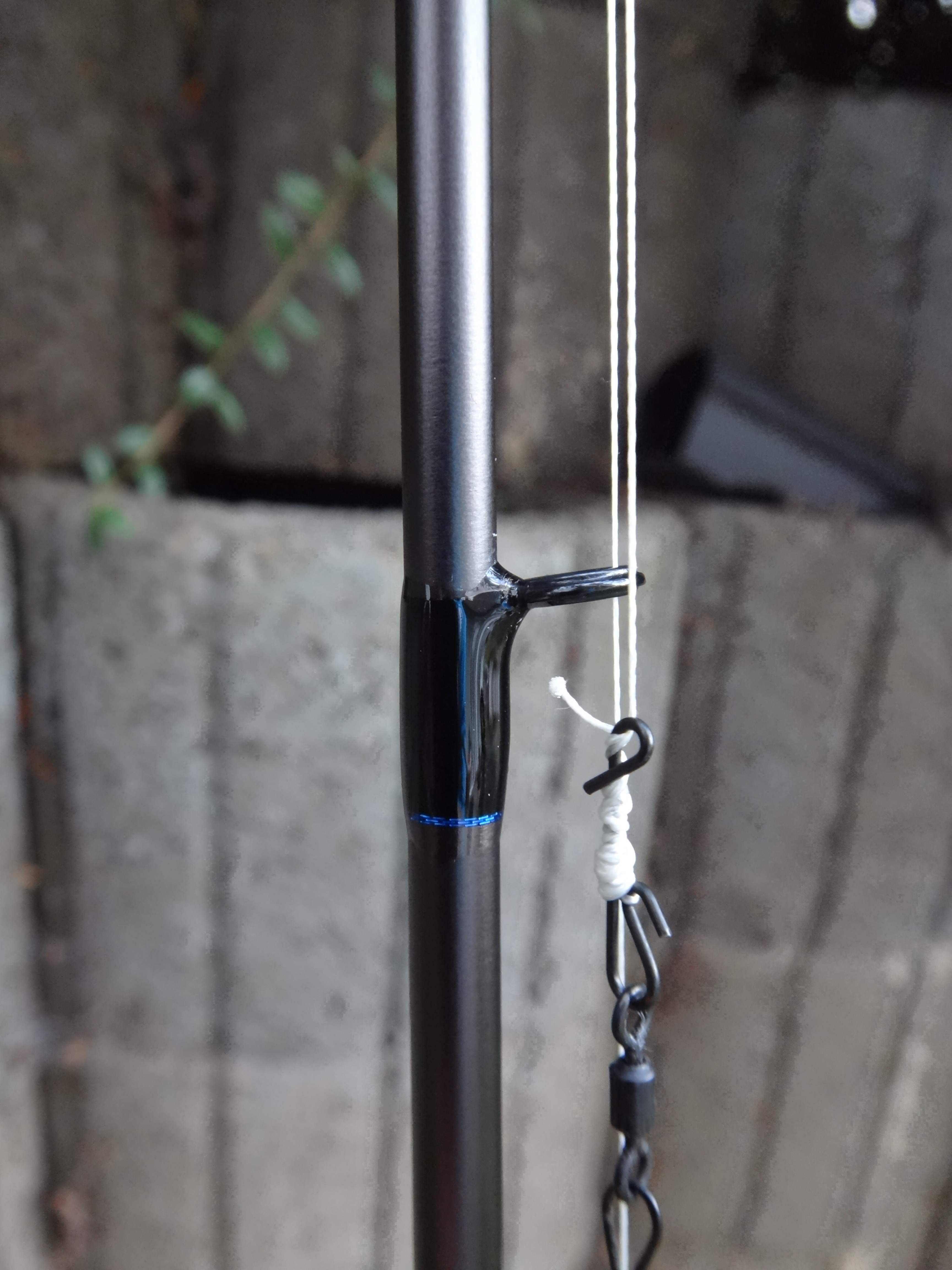 Kurz vorm Endspurt war es mir aber Hupe ob die Schrift gut aussieht denn Ich wollte die Rute endlich fertigstellen. Am Abend habe ich zwei Schichten nass in nass aufgetragen und bin ins Bett. Morgens aufgestanden und siehe da Hand-vor-Kopf Das Gummi das den Griff einspannt ist gerissen und die Rute hat auf dem Boden Gelegen. Der ganze Lack ist Richtung RH gelaufen. Da kommt echt Freude auf. Ich wieder nen Ganzen Tag damit verbracht den lack zu entfernen und alles wieder neu zu wickeln. Aber Ich hab es dann letztenendes doch geschafft fröhlich . Wenn ich sowas nochmal erlebe dann hör ich auf mit dem Rutenbau. Da verliere ich die Geduld.