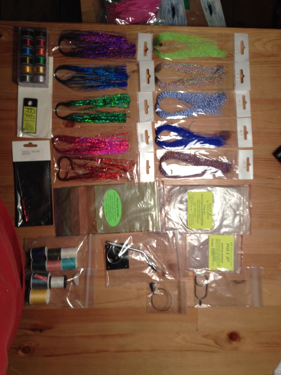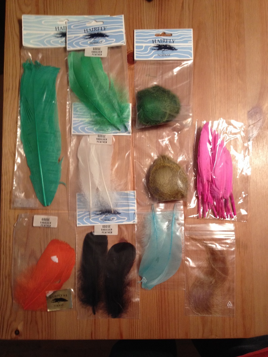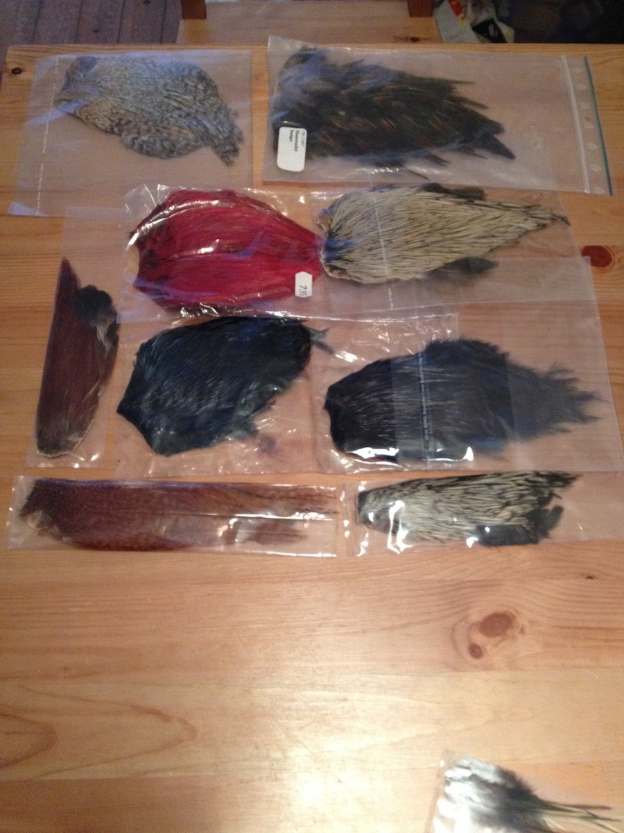 Dabei sind u.a. 6 Saddle, 3x 1/2 Saddle, 7-8 verschiedene Pakete (Hechel)-Federn, außerdem Perlhuhn- und Gänsefedern, Poly 2 Fly-Rite Dubbing (6 Farben), Flügelmaterial (6 Farben), Fell (ich denke mal Fuchs oder Polarfuchs?), verschiedene Garne, Floss (12 Farben), Christal Flash und Holo-Flash (insg. 10 Farben), Hechelklemme, Dubbing-Nadeln usw.