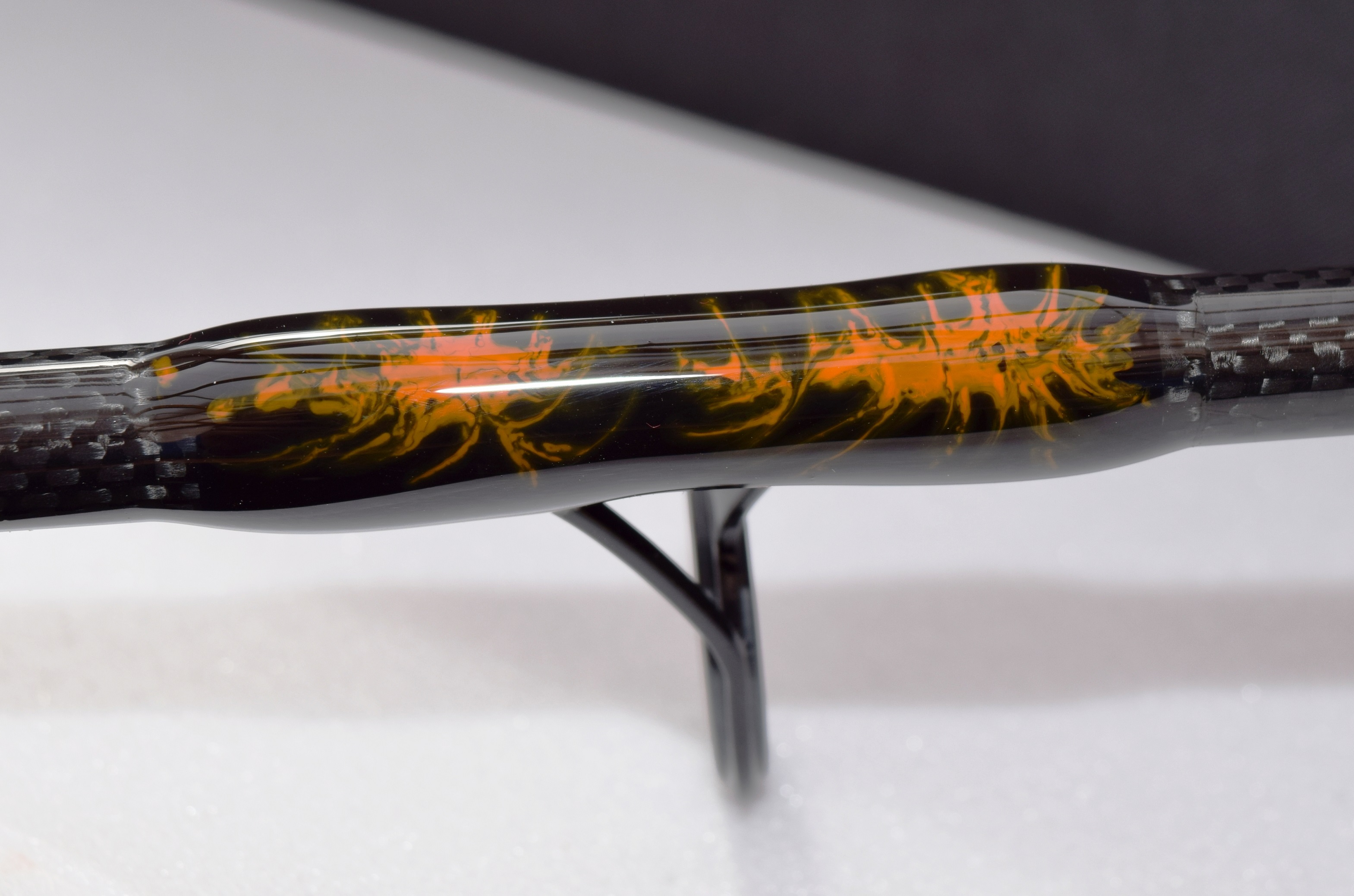 Klarlack anrühren, in drei kleine Becher aufteilen. Einen mit Schwarz, einen mit Orange und den dritten mit Weiß mischen. Dann Orange vollflächig auf die Wicklungen auftragen und je einen kleinen Tropfen Schwarz und Weiß in das flüssige Orange tropfen lassen. Dann mit einer Nadel die Farben schön ineinander ziehen und im Lackierschrank bei 30-40 Grad mindestens 1,5 Stunden verlaufen lassen. Klingt wie ein Backrezept, fällt mir gerade auf... :-)