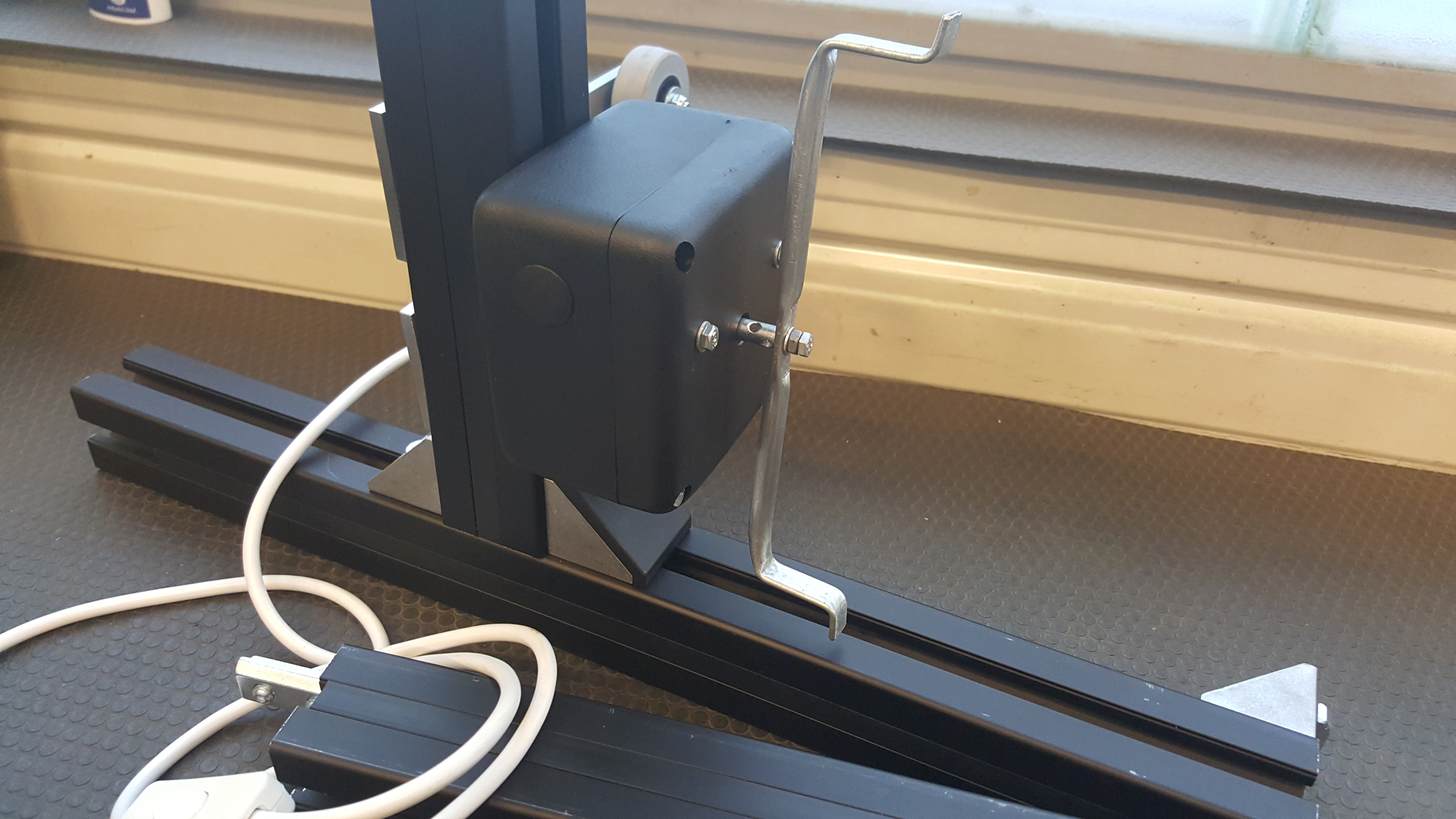 Die Garnführung lässt sich auf der kompletten Länge verschieben.Ist durch zwei Schrauben fixiert. Den Diskokukelmotor habe ich in ein Gehäuse verbaut.Dieser dreht mit 5 rpm.