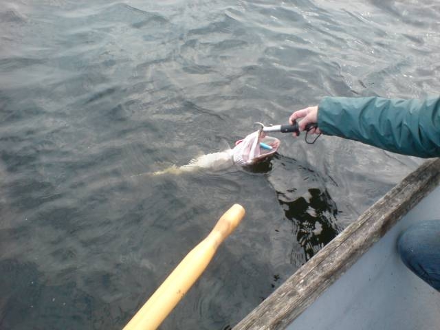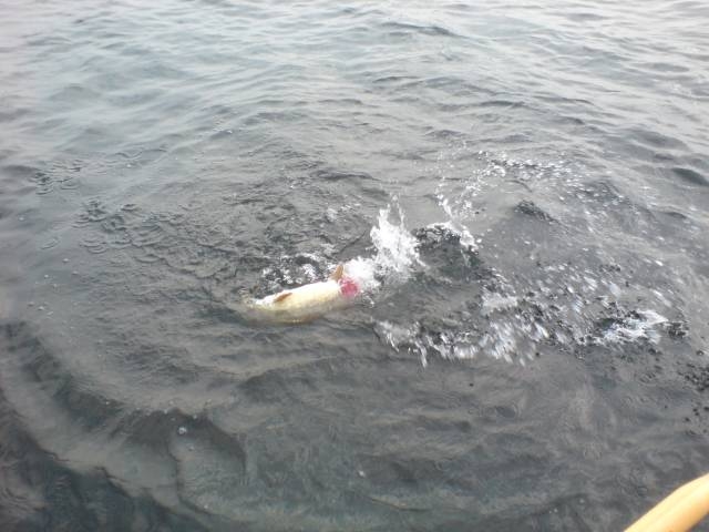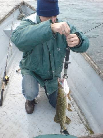 Vom Fischer Felix bekamen wir morgens den Tipp, daß die Hechte recht flach stehen würden, während die Barsche schon in die tieferen Gefilde abgewandert seien. Das sollte sich als richtig erweisen. Alexander fing auf einen Jerkbait - geführt an einer VHF 75 !!!!! - den einzigen Hecht des Tages. Der Esox wurde wieder zurückgesetzt, wir schätzten die Größe auf ca. 75-80cm. Der Drill fiel - ungewohnt für die Plöner Hechte - recht unspektakulär aus. Nach dem Landen sahen wir warum: dem Hecht fehlte die halbe Schwanzflosse.