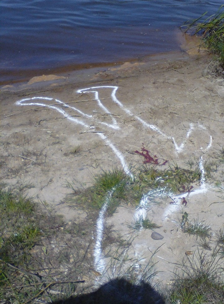 Nee, Spass beiseite, die Leichenumrisse waren nur die Überbleibsel einen Detektiv-Geländespiels, dass gestern ein Haufen 10-jährige Kiddies an der Skjern Au spielten Zweidaumenhoch