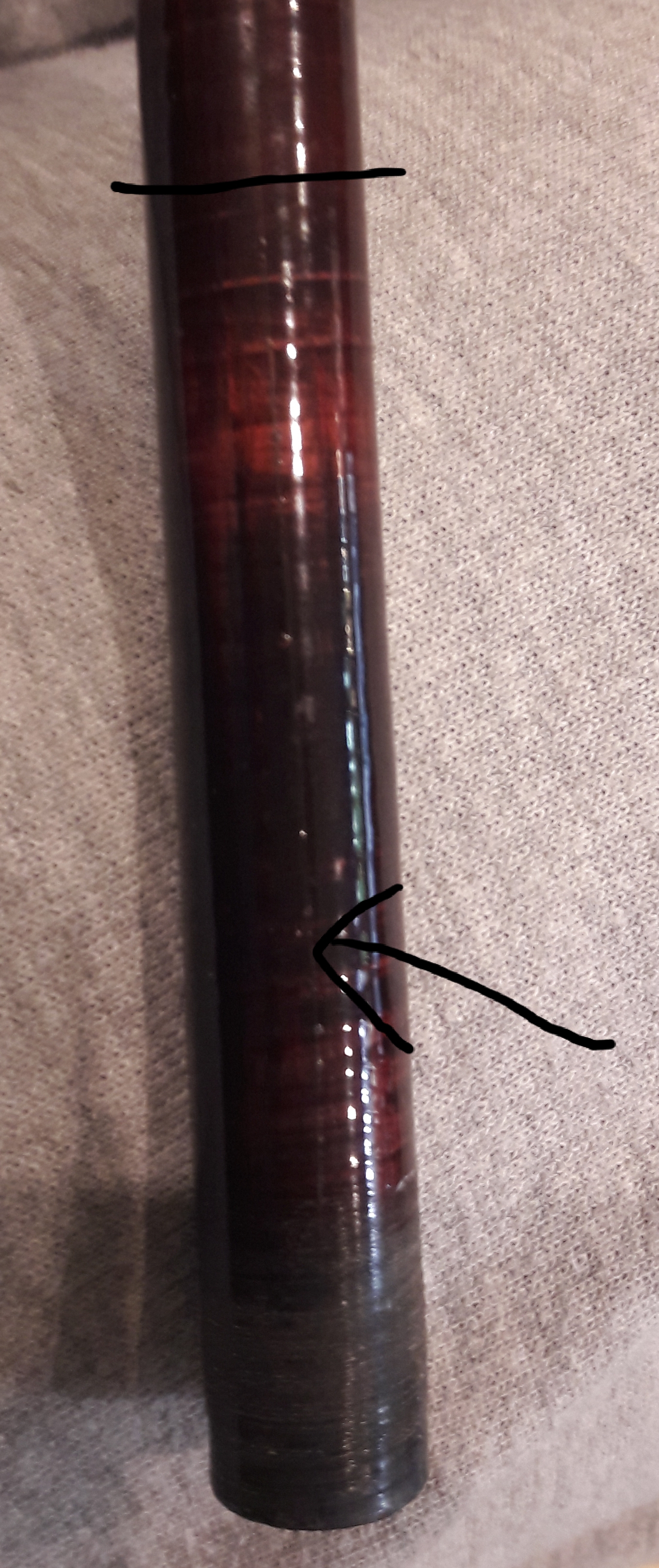 Es überlappt den riss um knapp 4 cm ich hab noch am hinteren Ende eine zierwicklung mit ner geflochtenen Schnur gemacht und am vorderen Ende eine mit schwarzem wickelgarn und das ganze 2 mal lackiert.
