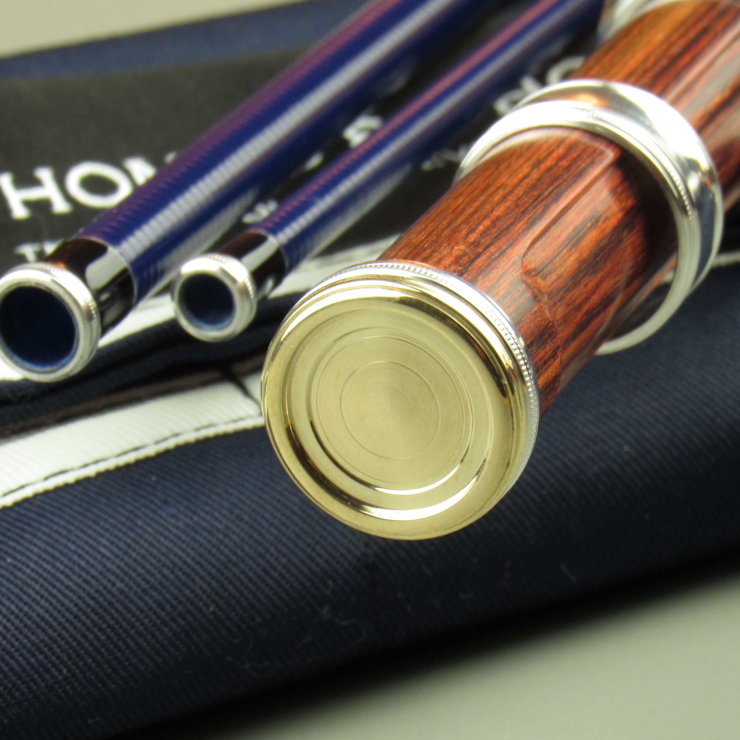 Aufgebaut mit Snakebrand Ringen, handgefertigtem Rollenhalter aus Nickelsilber und Bimetal Brass Endkappe, gewickelt mit Kimonoseide und Tipping aus farbfixierter Seide, Insert aus stabilisiertem Holz gedreht und gefräst. Zum Schutz der Überschübe habe ich noch Nickelsilber Ferulle Ringe spendiert.