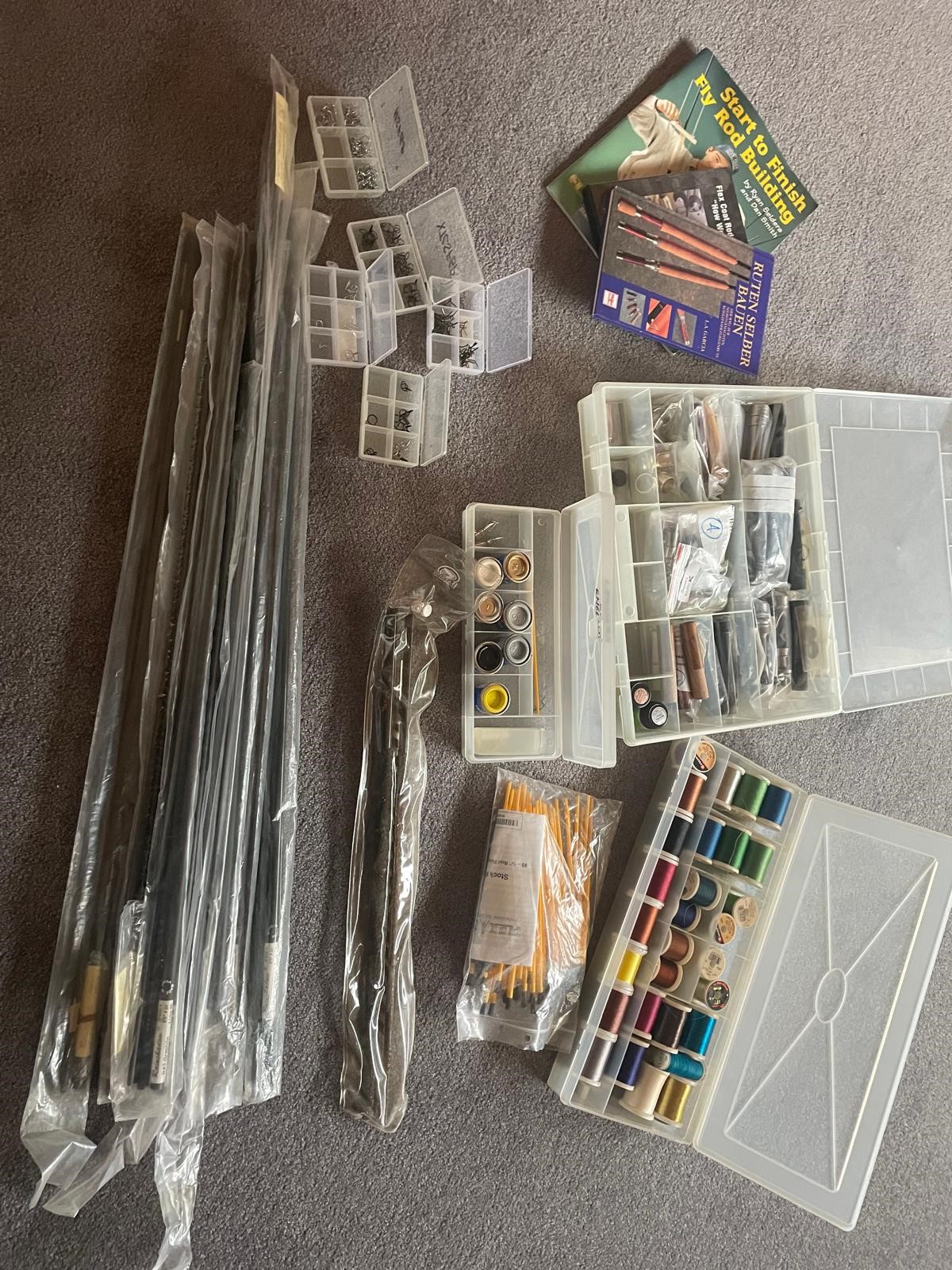 Es ist eine Vielzahl an Fliegenrutenblanks, Rollenhaltern, Kork, Ringen usw.