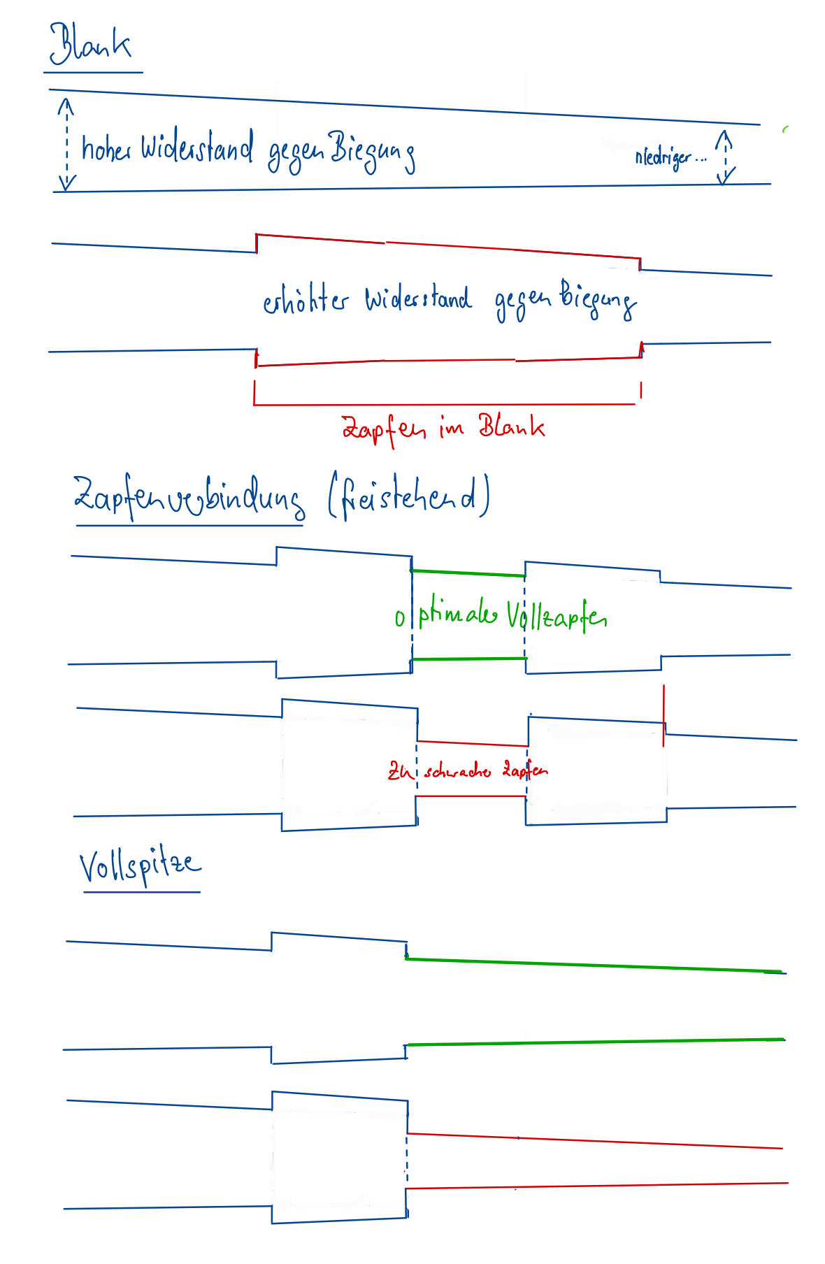 Da Du ja nun auch Zapfen betrachtest und berechnest, habe ich dazu ein Statement. Die Bestimmung des Zapfens ist erst gegeben, wenn ein Unter und Oberteil zusammengesteckt sind, anders als bei eingesetzten Spitzen. Sowohl in Konstruktion als auch in Funktion, meiner Meinung nach anders. Hier ergibt sich, wie ich finde, eine etwas andere Betrachtungsweise. Ich habe in den Bereichen der Steckungen ganz unterschiedliche Materialkonzentrationen dicht nebeneinander liegend, schon dadurch, dass der Zapfen auf der einen Seite eingeklebt und auf der anderen eingesteckt ist. Ich versuche mal eine Zeichnung um zu erklären, was ich meine. Ich nehme bisher an, das Brüche, die oberhalb des Zapfen stattfinden, der geringeren Materialkonzentration und nicht der scharfen Kante eines Zapfens geschuldet sind und deshalb finde ich z.B. das Anspitzen von Zapfen aus funktionellen Gründen, eher nicht zielführend. Allerdings Dein Ansatz mit gebohrten Zapfen, fand ich interessant. Ich könnte mir Zapfen vorstellen, die von beiden Seiten eine konische Bohrung haben um aufkommenden Problematiken, die sich aus Teilung und Verbindung ergeben,entgegenzuwirken. Einteilig als Rute ist halt unschlagbar, außer beim Transport, finde ich.