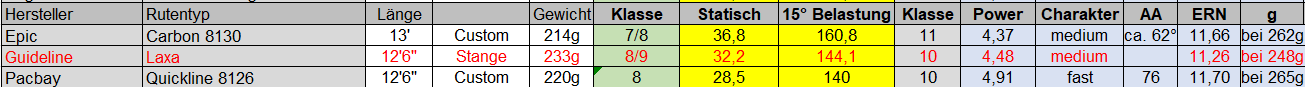 Ich würde sagen, dass die deutliche Spitzenaktion bei der geringen 3,75° Auslenkung hier einen zu geringen Wert vorgibt, da beim Zweihandwerfen das Rückgrat der Rute deutlich wichtiger ist, als bei einer Einhandrute. Es sollen ja in der Regel höhere Gewichte auf größere Weite transportiert werden. Bei der sehr schnellen Quickline ist hier der Messwert der Spitzenauslenkung auf 3,75° zu wenig aussagekräftig. Hier zählt das Rückgrat, was durch die höhere Auslenkung der ERN besser bestimmt wird.
