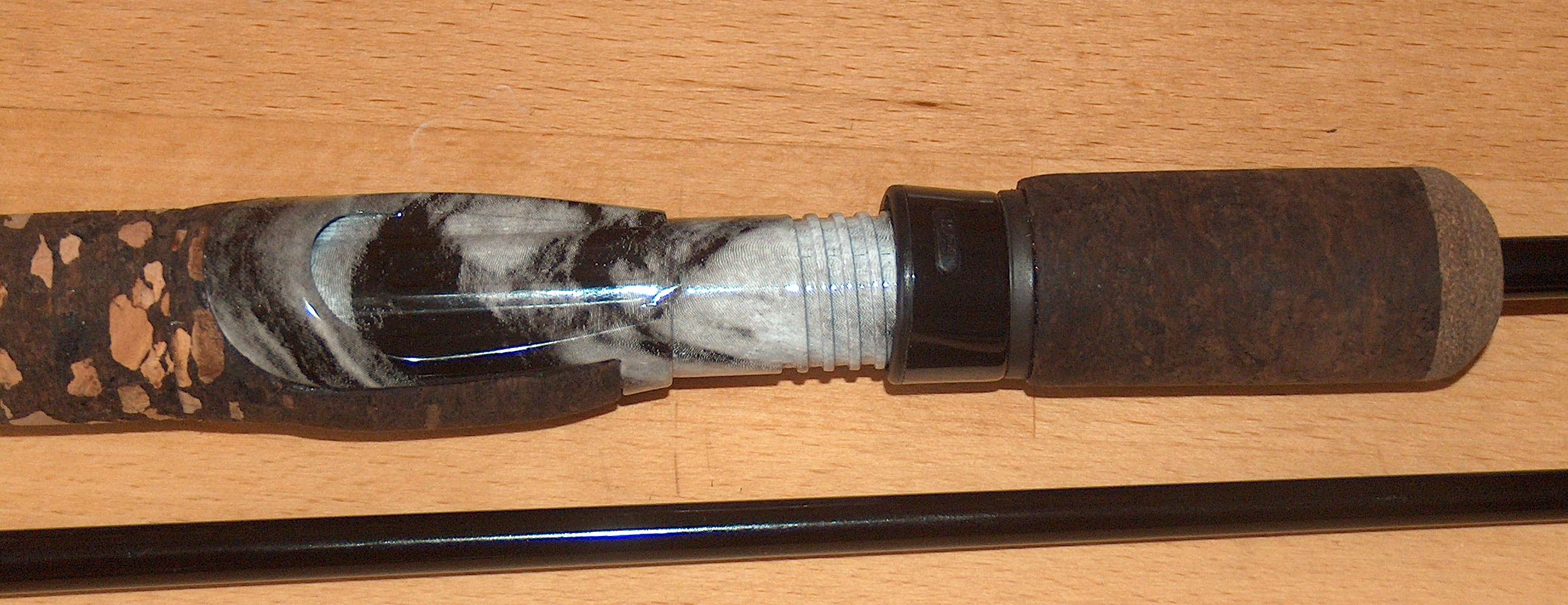 Griff: Selbst zusammengeleimt aus Scheiben verschiedener Korksorten (von T24 die Sorten "Burnt", "Starlight Dunkel", "Starlight Hell" , Rubberkork" & "Supreme" ) und selbst in Form geschliffen und an den IPS-RH angepasst. Die Farben Burnt und Rubberkork kamen auch am KDPS-Schraubteil zum Einsatz.