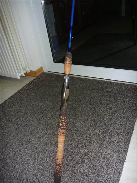 Den griff habe ich mir aus Borl-kork und normalen kork gemacht, den rollenhalter ist aus Holz. Das ganze wiegt etwa 280gr. Die Ringen sind von ALPS, Ti-MNXZG, in die größen 25-16-10-8-8 + 8. Hakenöse ist von TAC. Am griff habe ich einen einfachen kreuzwicklung versteckt, die findet man bei Sonnenlicht, wenn das garn gut beleuchtet is, ist es transparant genug um den kreuzwicklung zu sehen. Damit man den auch sehen kann ist die komplette kreuzwicklung mit silber-garn unterwickelt. Die ringen sind mit ein Sapphire Blue garn, starke A gewickelt, mit eine kleine zierwicklung in Silber. Die rute ist noch nicht ganz fertig, es fehlt noch die endkappe und ein Decal muss auch noch drauf. Die endkappe muss ich noch schleifen, das Decal liegt schon fertig.