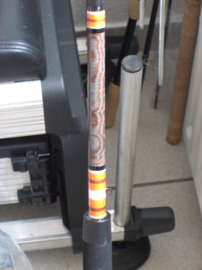 jetzt ist das Werk fast vollbracht. Den Tiger ,den ich über den Griff gewickelt hab(und eine Kurzanleitung), den hab ich im anderen Tröt schon eingestellt. Das Spitzenteil ist fertig bearbeitet und dreht nun trocken. Ich hoffe meine gewagte Farbkombination kommt an.