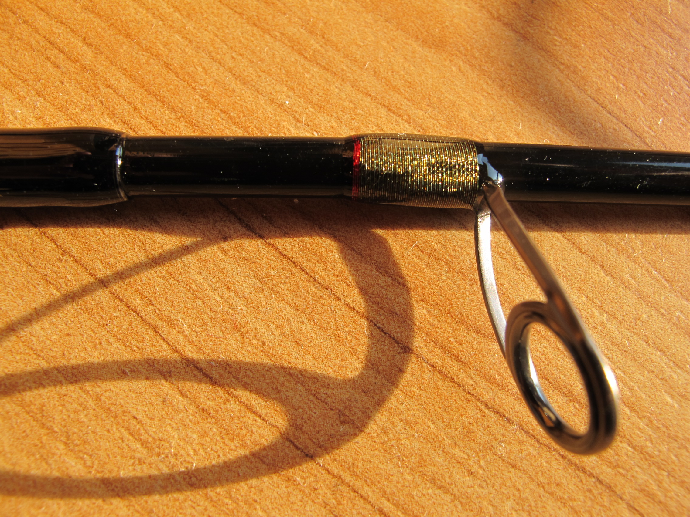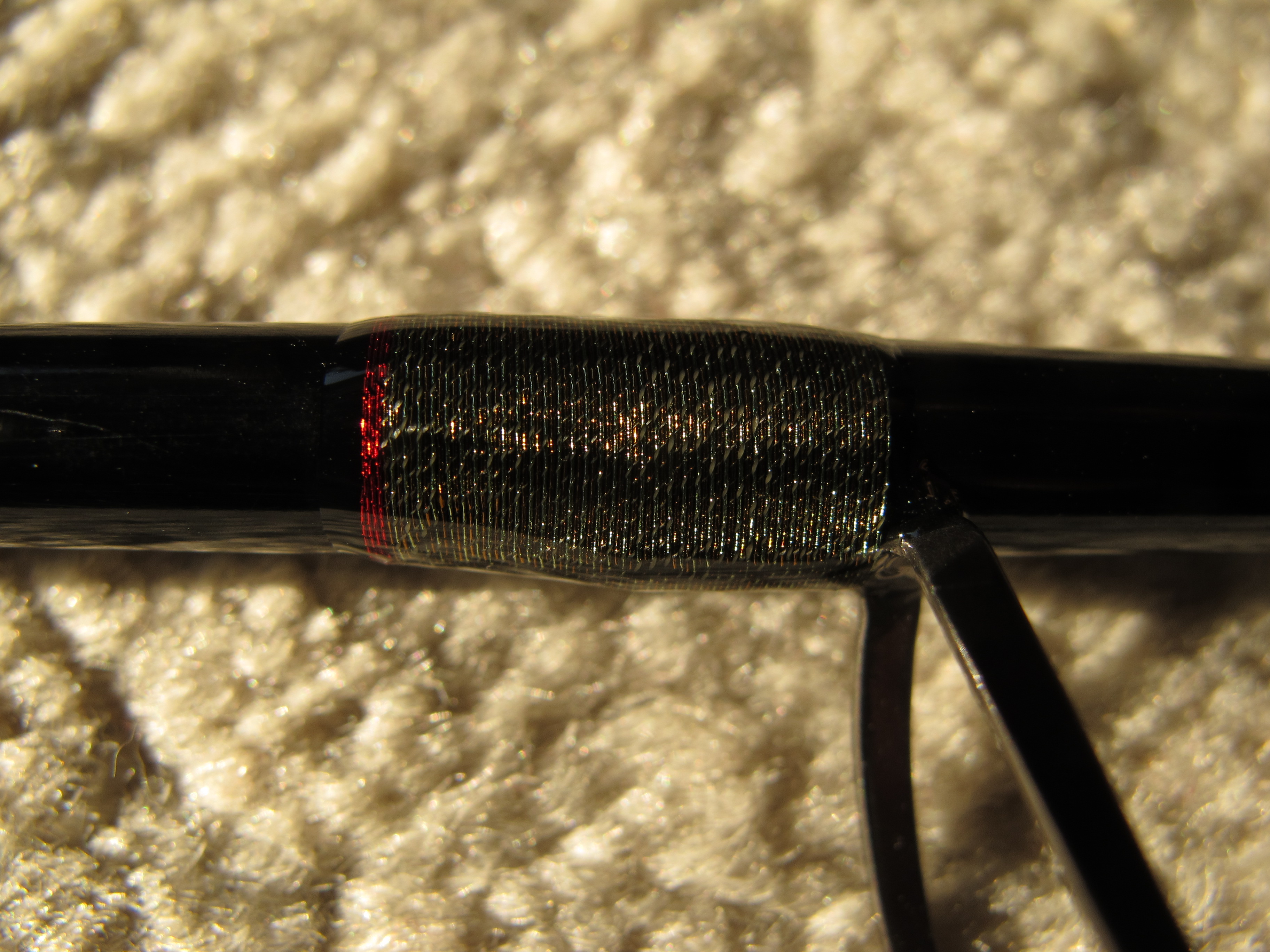 Der blank wurde verlängert und geteilt und mit einer Glasfaserüberschubhülse wieder verbunden. Diese Hülse macht die Biegekurve etwas mit. Die Hülse wurde dann komplett mit schwarzer Bindeseide überwickelt.