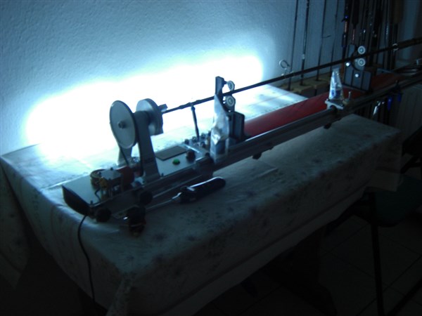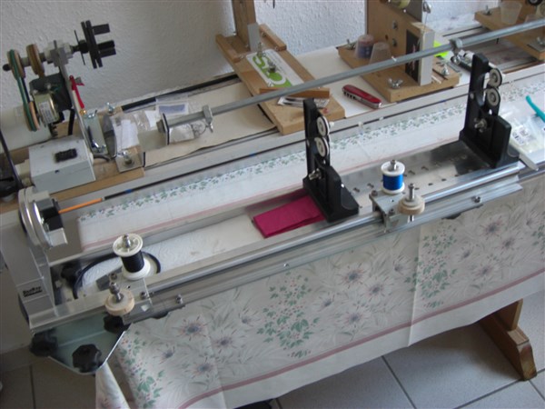Durch Zufall kam ich an ein spezielles Aluprofil, von dem ich überzeugt war, das Pacbays Aufnahmefutter passen sollte. Das lag schon geraume Zeit im Schrank. Als das sichergestellt war, habe ich noch Blankführungen aus gleichem Hause bestellt. Für die Garnführung habe ich eine Linearführung montiert, die sich insgesamt über die Länge der Bank verschieben lässt. Garnrollen und Garnbremsen sind auf darauf gleitenden Linearlagern montiert. Ich hab zwar schon mehrfach Motorregelungen für Getriebemotore gebaut, im Netz, beim Chinamann fand ich dann aber eine Motorregelung , die nebem einem Ein/Ausschalter und Drehpoti noch ein Display aufweisst, wo die prozentual zur Eingangsspannung abgerufene Spannung angezeigt wird, das fand ich ganz nett. Der Lackiermotor läuft gegen die Wickelrichtung, im Antriebsrad befindet sich ein Freilauflager, so kann ich den Blank bei ausgeschalteten Motor auch drehen und wickeln, wenn der Riemen gespannt ist und Dank des Motors haben wir dann eine Rücklaufsperre. So kann man jederzeit innerhalb einer Wicklung mal aussetzen. Ich werde die Bank noch um einen schneller drehenden Getriebemotor ergänzen, der am selben Riementrieb und auch gegen den Freilauf dreht. Zwischen den Motoren möchte ich umschalten können.