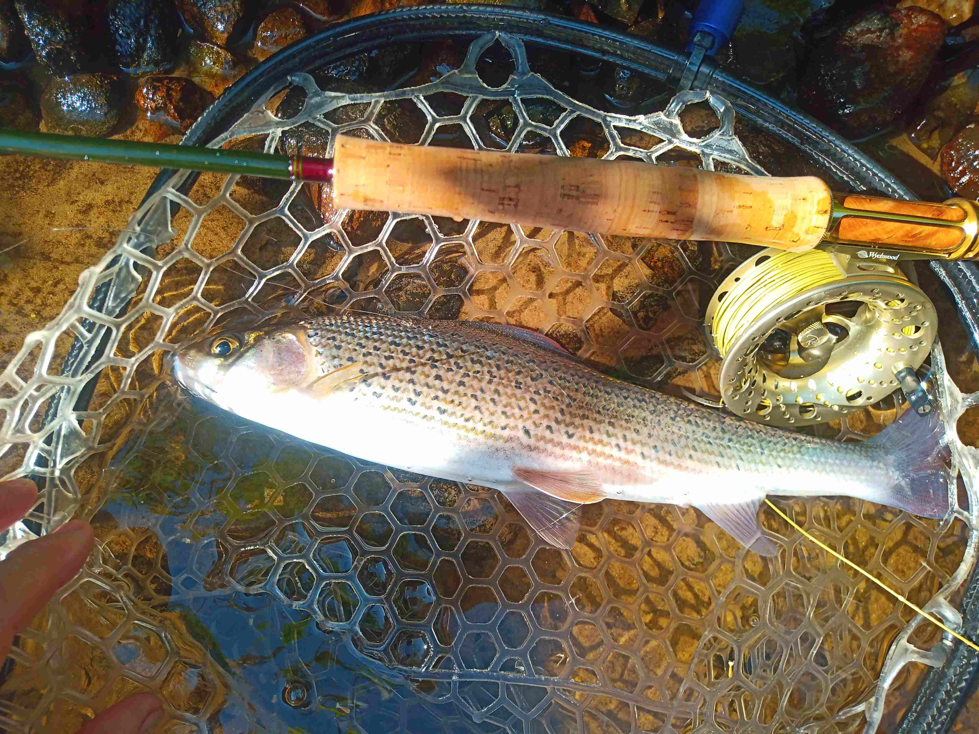 Bilder gibt es nicht viele, dafür aber auch welche mit Ambiente. Die auf dem Bild war die erste (und kleinste) von mehreren Äschen am ersten Tag mit der Rute.