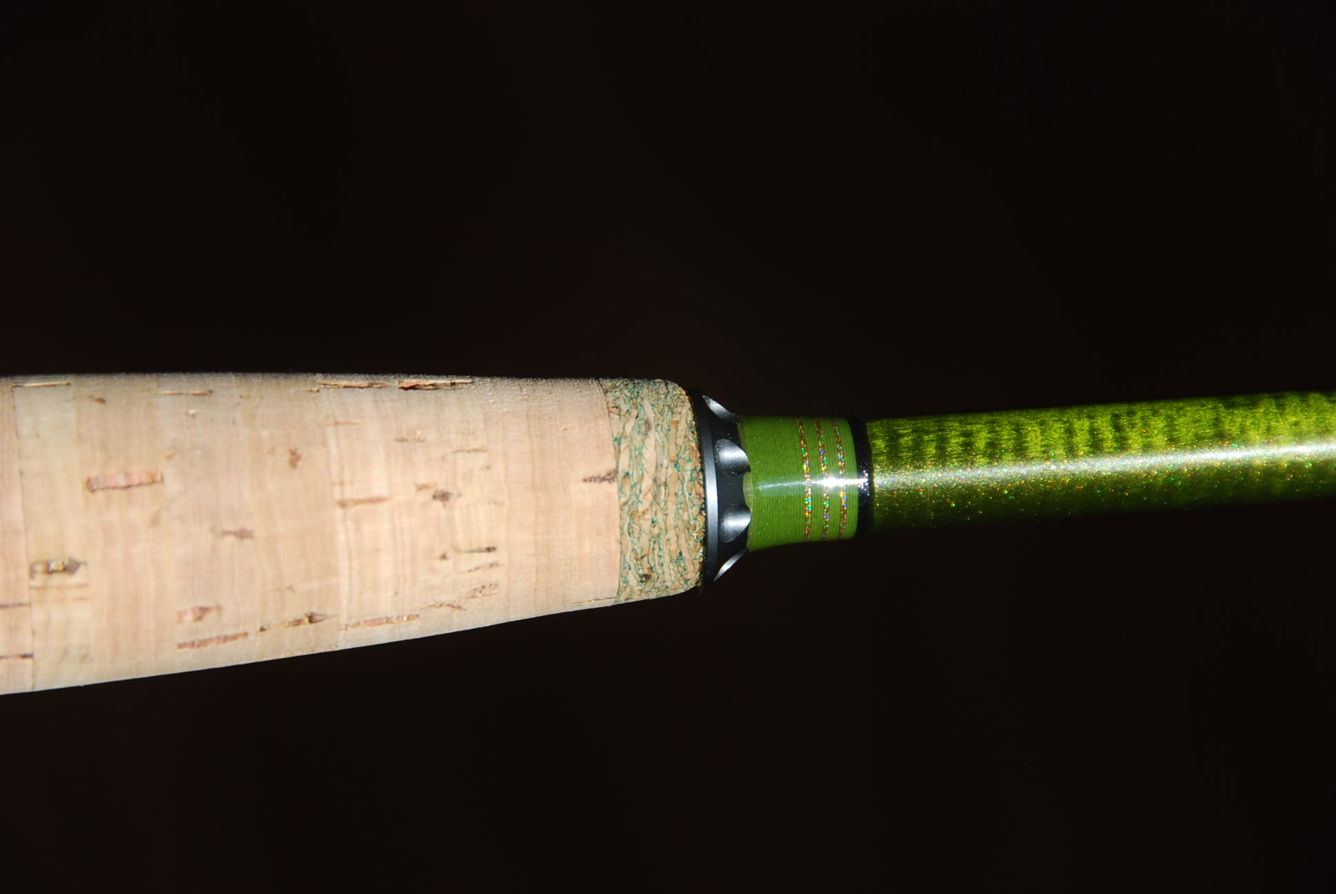 Griff aus einem zerlegtem und neu aufgeteilten Fertiggriff, vorne und hinten abgeschlossen mit grünem Rubberkork, Fightingbutt aus 3 Scheiben Rubber und Kork. Alles dann in die Endform gedreht ( diesmal auf der eigenen Werkbank und nicht auf dem etwas wackeliegen Geländer wie letztes Jahr fröhlich )