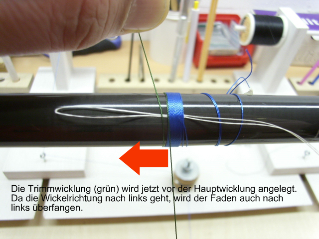 Du legst dazu ca. 15cm Trimmfaden mittig einmal gekreuzt um den Blank und wickelst beide Enden spiralförmig nach hinten. Dann dort festtapen.