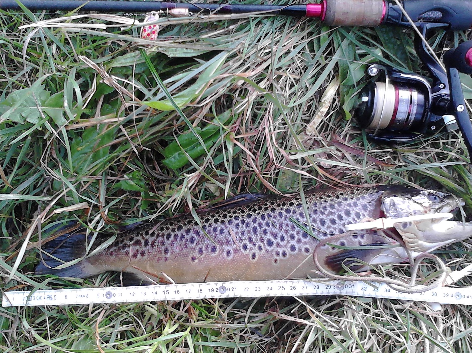 Bei einer Stelle, die das Fischen stromauf mit Spinner nicht zuließ, wurde ein 2-teiliger Rapala stromab auf Tauchstation geschickt und nach dem er (hervorragend fühlbar in der neuen Rute) erst rund 2 m näher an mich heran gewackelt war, machte es „Tock“ und es kam Leben in die Schnur!