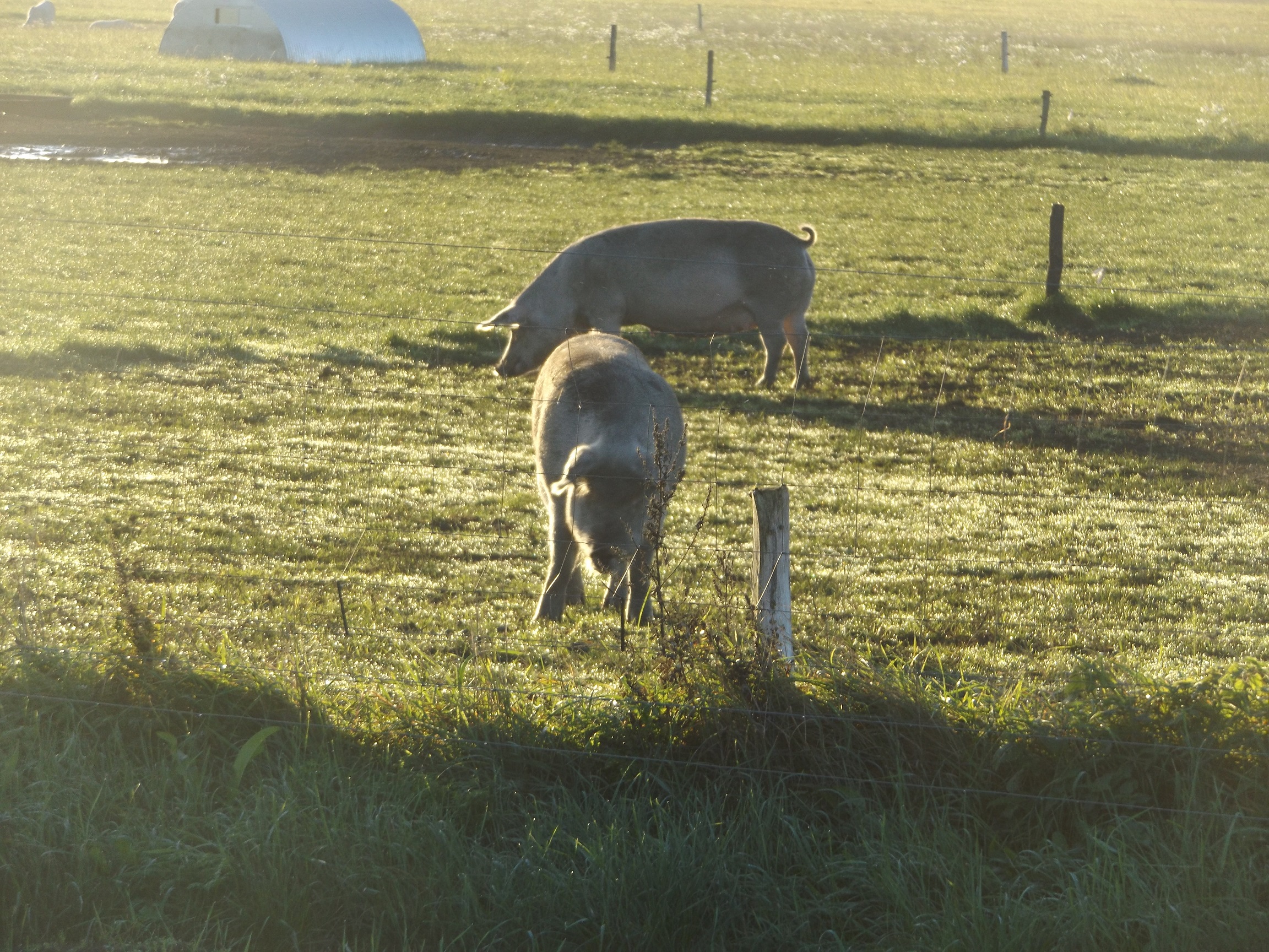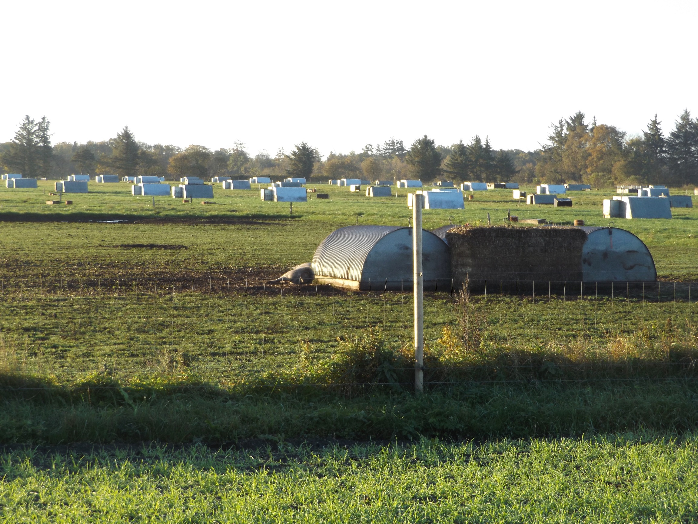 Des positive an diesem zuerst verkorksten Morgen: Auf dem Rückweg kam ich an einem Feld vorbei, wo Schweinhaltung praktiziert wird, wie sie sein sollte. Kleine Hütten mit Muttersauen und Ferkeln auf dem Gelände, die sich frei bewegen und miteinander herumlaufen dürfen. So sehen glückliche Schweine aus!
