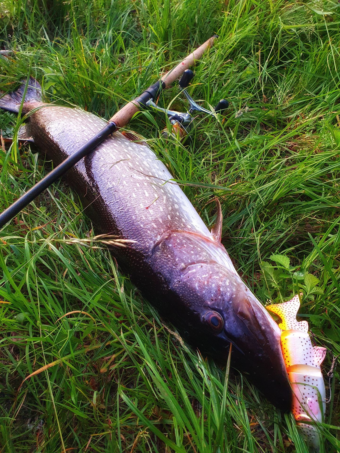 Da blieb mir also nix anderes übrig, als meine alte Sportex Kev Pike mit 3.00m und 80g Wurfgewicht zu entstauben und mit an unsere Seen zu nehmen. In Ermangelung einer mit geflochtener Schnur bestückten Hechtspinnrolle habe ich ne Shimano Exage 4000 mit 35er Mono genommen und eine Savage Gear Line Thru Trout mit 93g "Goldforelle", die jahrelang originalverpackt im Angelkeller rumlag, drangehängt. Da sich unsere Hechte in den Seen eh immer über die frisch besetzten Forellen freuen, sollte da doch noch was gehen.