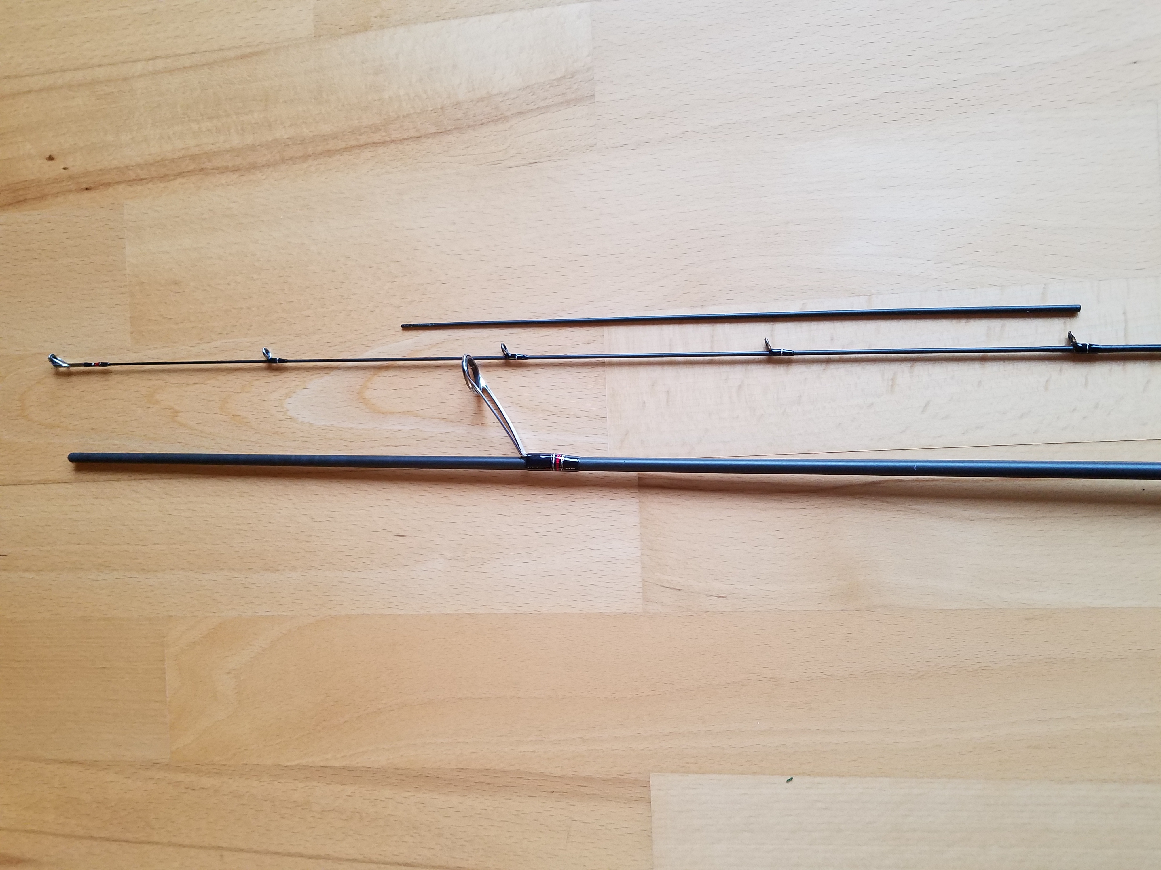 Grundlage sind die ersten beiden Teile von einem Fliegenrutenblank aus China mit 10‘6“ #7/8 aus 30T Carbon. Wie ich gerade hier im Forum gelernt habe also ein Blank aus einem intermediate Modulus Carbon (vergleichbar mit IM8 ). Der Blank ist schlank, hat eine recht kräftige Wandung und eine schöne knackige Rückstellung. Ob er als Switchrute etwas getaugt hätte weiß ich nicht, da ich hier keine Ahnung habe. Ich habe auch schon zwei selbstgebaute Switchruten rumstehen, die ich beide nicht fische weil ich mit dieser verflixten Zweihandtechnik nicht warm werde. Dass der Blank als Spinnrutenblank taugt wusste ich, da ich seinen Zwilling bereits als leichte dreiteilige Spinnrute (5-20 Gramm) für meinen Bruder aufgebaut habe.