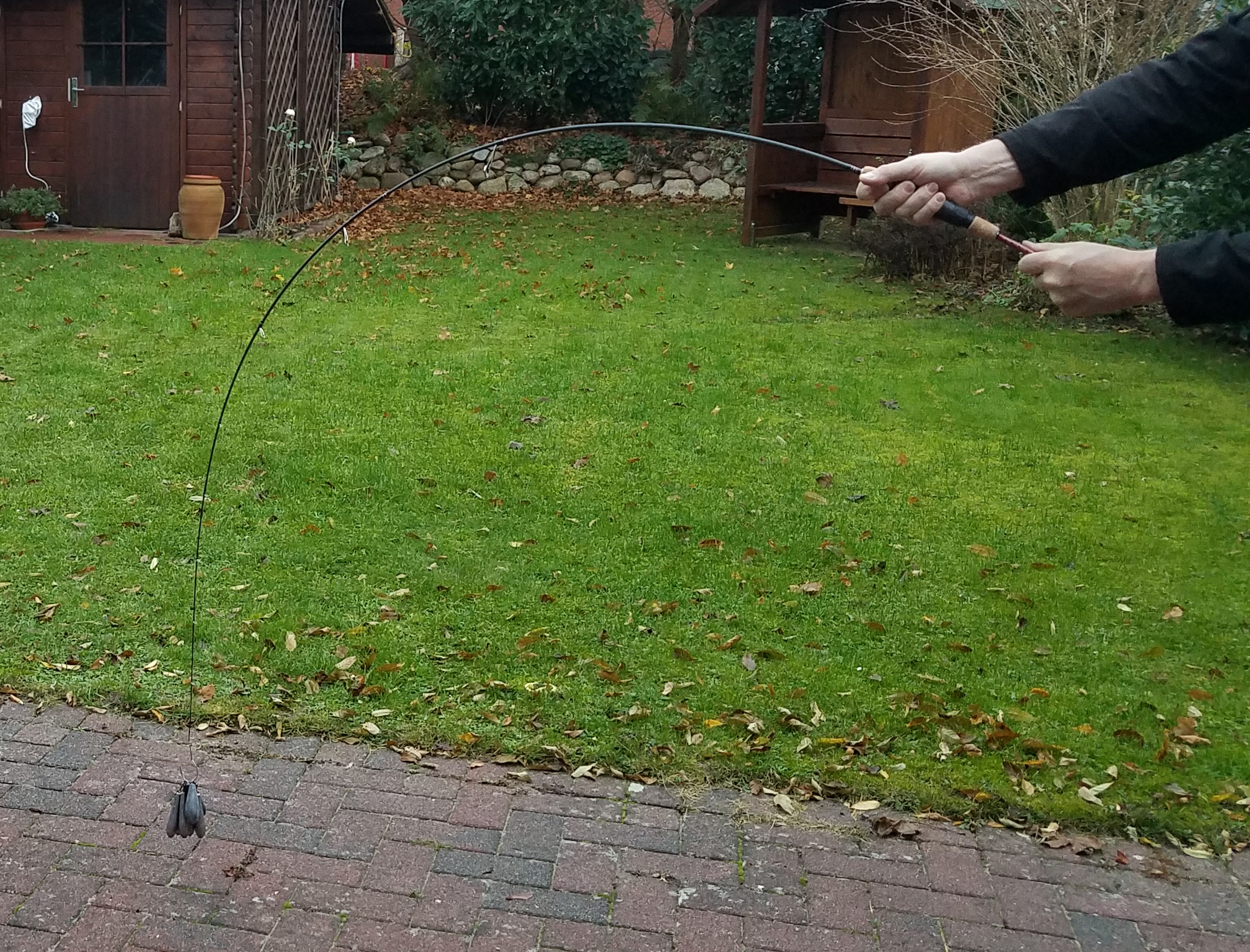 Die Belastung mit 500 Gramm war die eigentlich schon Obergrenze. Bei 1000 Gramm habe ich schon mit einem lauten Knall gerechnet. Wollte aber wissen, ob die Spitze hält und was die Rute so abkann.