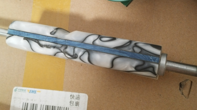 Ich hatte mal was ganz ähnliches zusammengklebt, mit einer blauen Juma Platte in der Mitte, dann rechts und links je eine Lage Hartpapier und dann rechts und links eine Platte Acryl in Perlmut mit schwarzen Akzenten. Der Rohling liegt bei mir auch schon ewig vergessen rum und sollte mal ein Splitgriff werden. Da könnte ich glatt mal drangehen, wenn es endlich kälter wird.