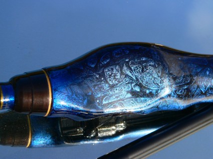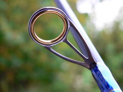 Der geteilte Griff ist aus gedrechselten Zebranoholz passgenau angefertigt. Beringt habe ich die Rute 10:1 mit einer Spiralberingung und ALPS blue Zirkonium Ringen. Die ersten beiden Ringe sind Doppelsteg gefolgt von Einsteg recht schnell runter auf Größe 6. Um gerade in der Spitze etwas Gewicht zu sparen habe ich dort auf aufwendige Zierwicklungen verzichtet. Fürs Auge ist eine Kreuzwicklung als Stützwicklung an der untersten Steckverbindung angebracht. Der Schriftzug blaues Wunder ist oberhalb des Griffes als weiterer Augenschmaus eingewebt.