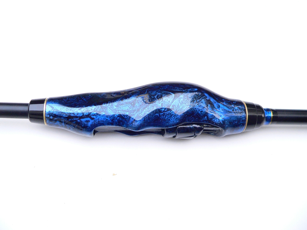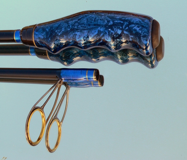 Meine ist das "blaue Wunder" mit dem gedrechselten Holzgriff. Ich wollte eine Rute zum Baitcastfischen für Hechte bauen die nicht ganz so kurz ist wie meine m eisten anderen. Daher habe ich noch ein 6. Teil hinzugenommen. Das Blank habe ich dann in einer anderen Farbe lackiert, da ich schwarz doch etwas trist fand.