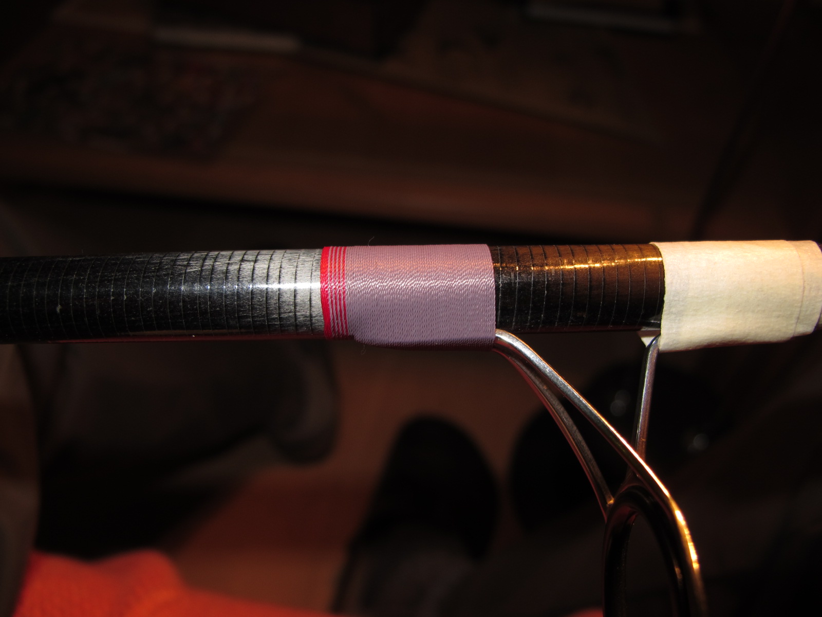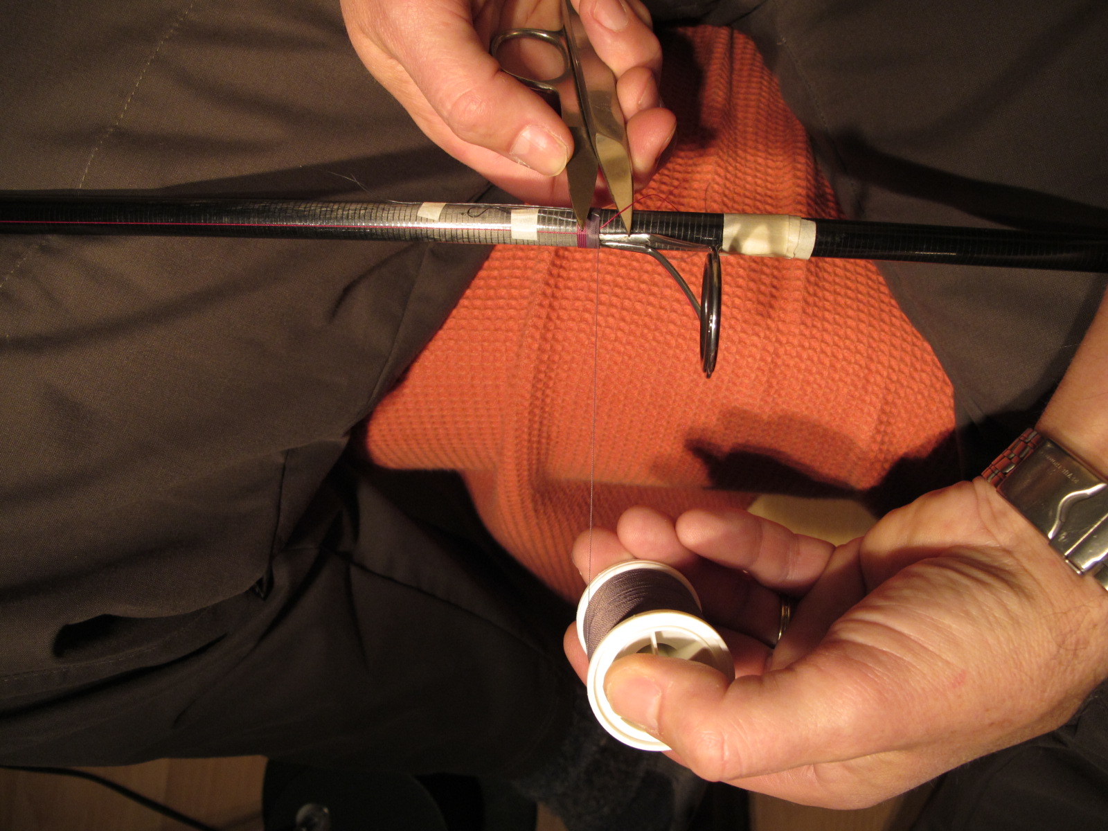 Zum Abschluss der Wicklung wird das Garn mit dem rechten Daumennagel gehalten, ich lege die Spule weg und schneide mit links den Faden ab, Fadenende einschlaufen, an ziehen, abschneiden, durchziehen-- alles kein Problem, die ganze Zeit ist die Rute mit dem linken Unterarm fixiert.