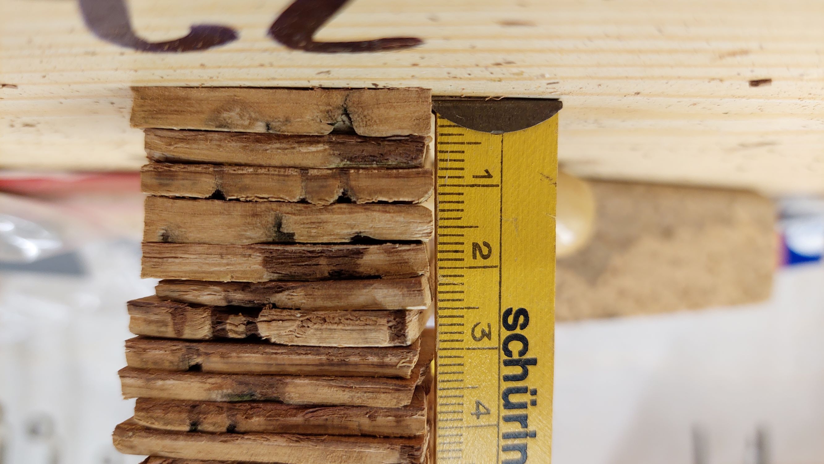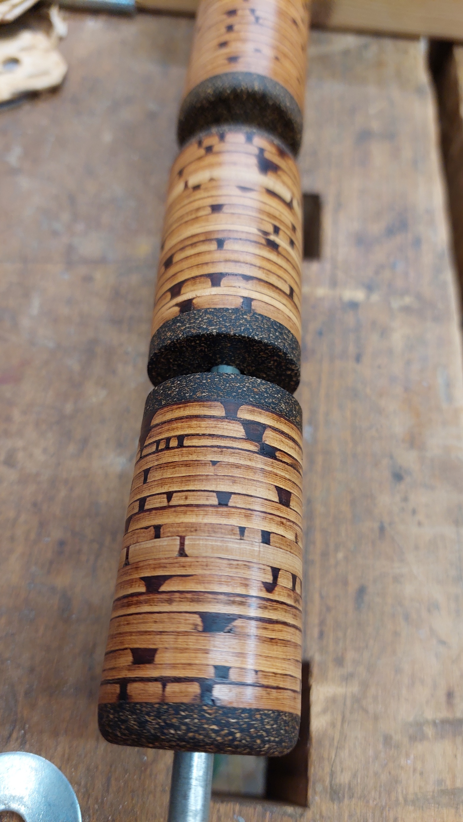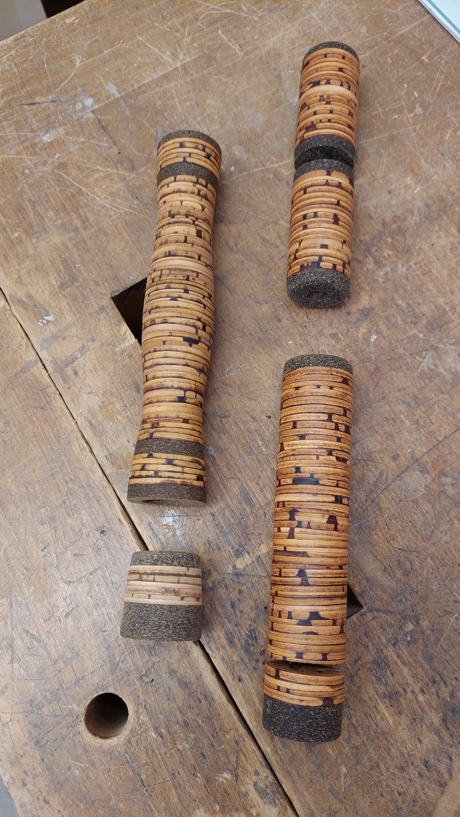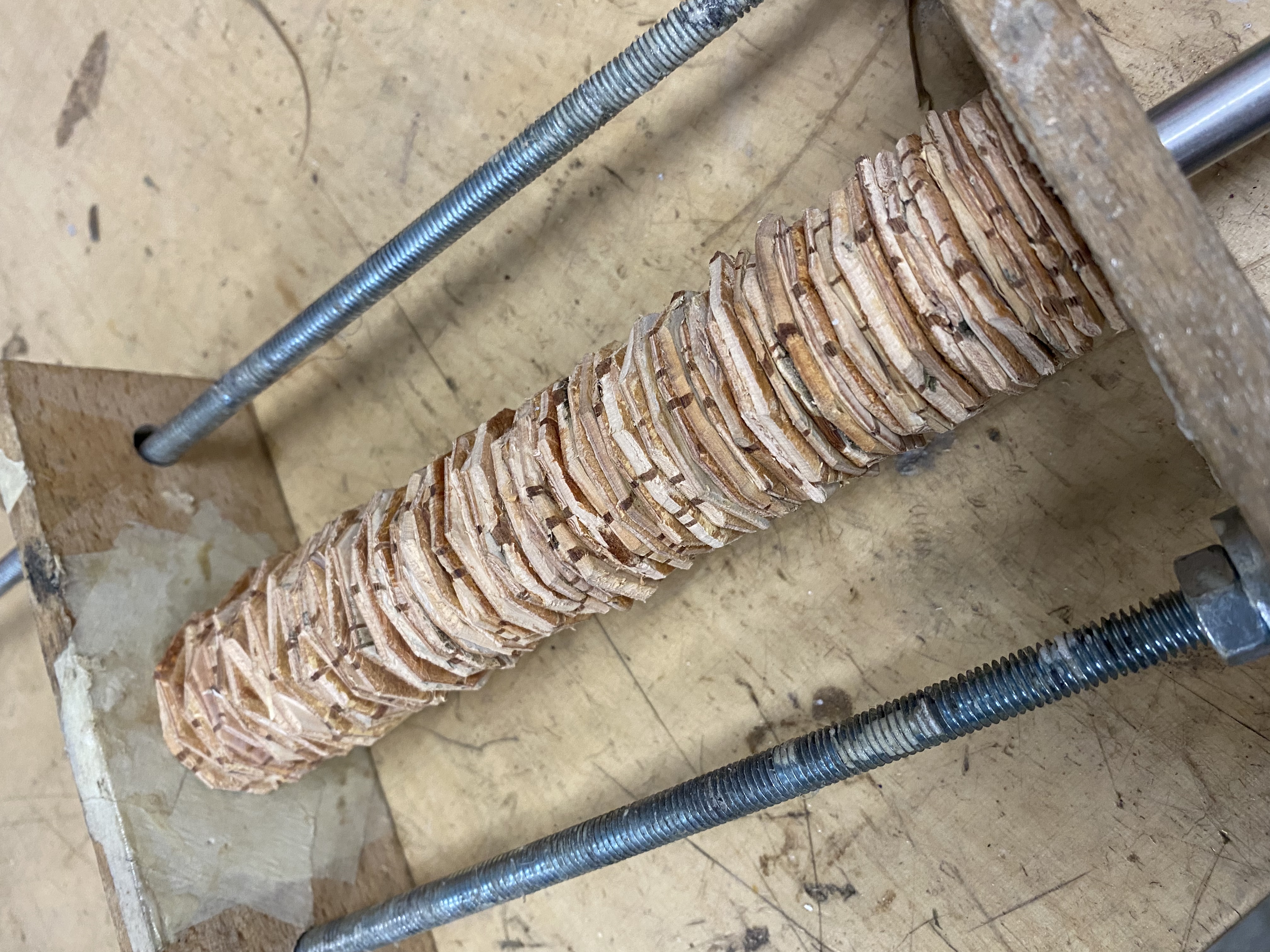 ich habe die Woche schnell zwei kurze Stücke zusammengeklebt. Da gingen schon ein paar Scheiben bei drauf. Das eine Stück ist aus extra dünnen Scheiben zusammengefügt und wurde stark (stärker als das andere) gepresset. Habe da extra viel von der Bastschicht runter gemacht. Mal schauen, wann ich da Lust und Zeit finde, weiter zu machen.