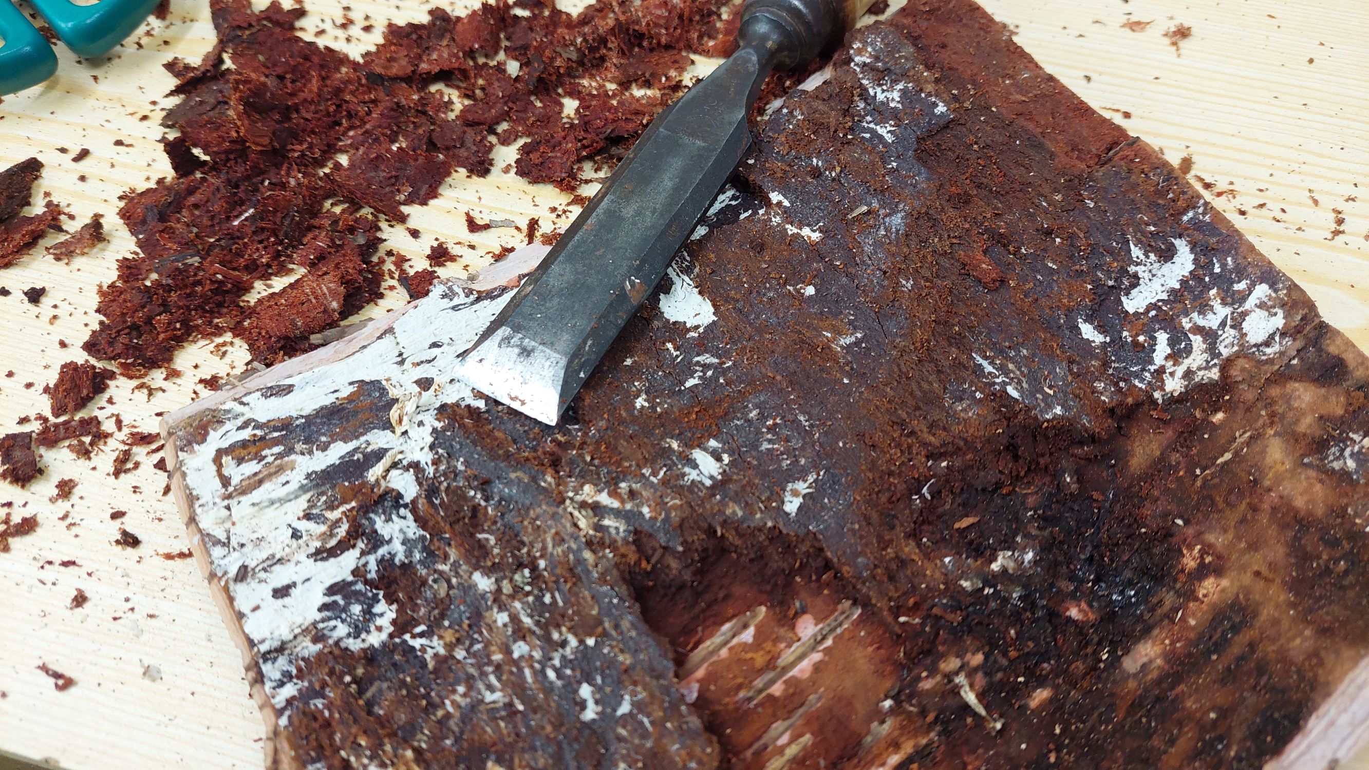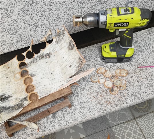 das schälen war schon Schweine Arbeit es waren mehrere Griffe davon geplant im gegenteil war das Sägen mit Lochsäge freundlicher und staubarmer in vergleich zu trockener Rinde..