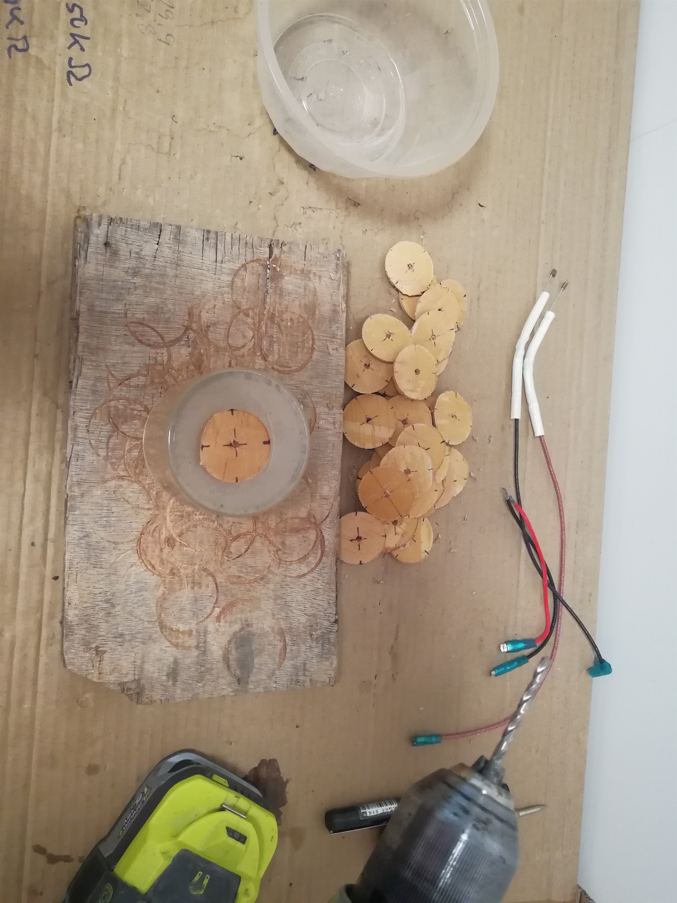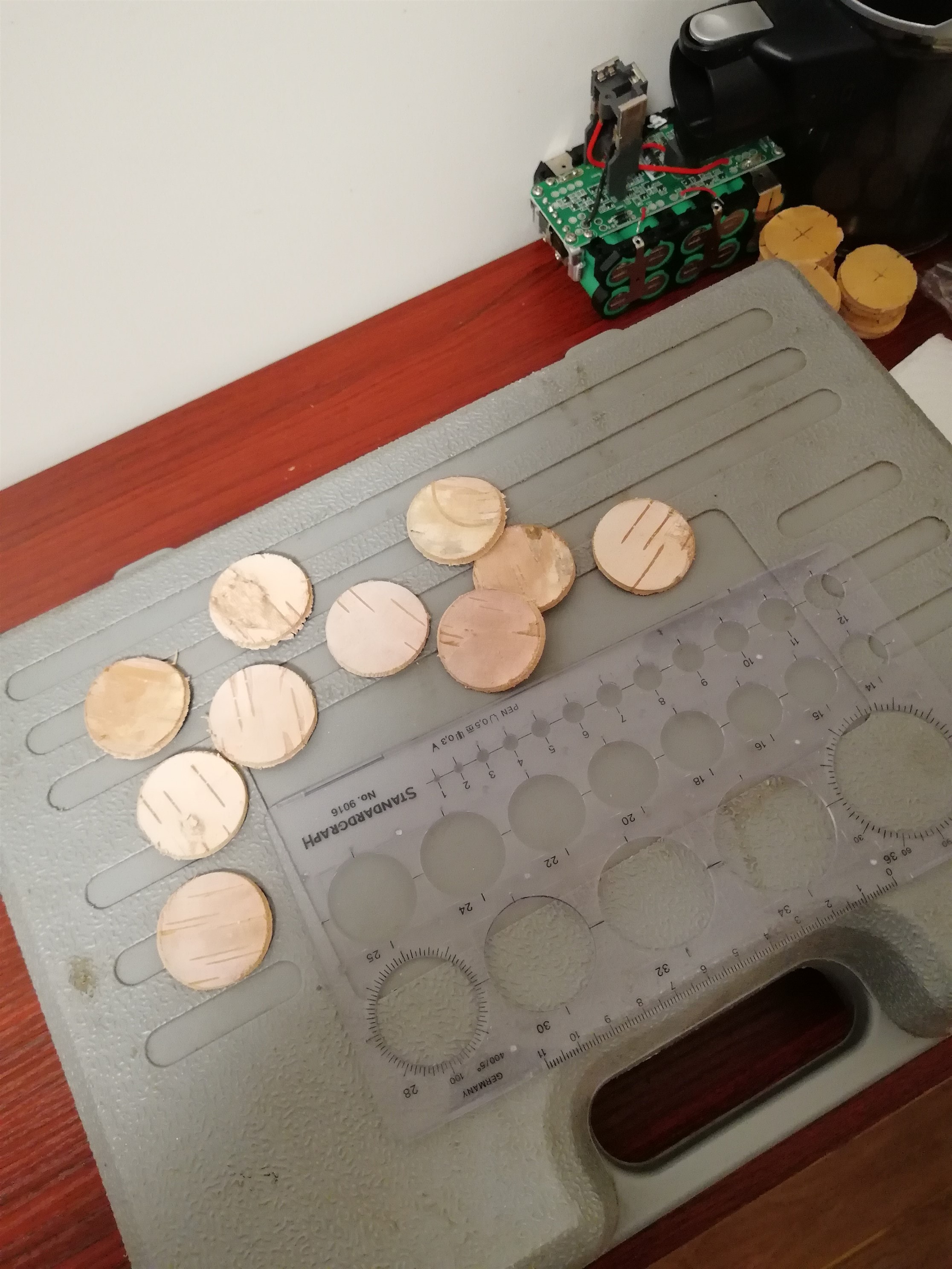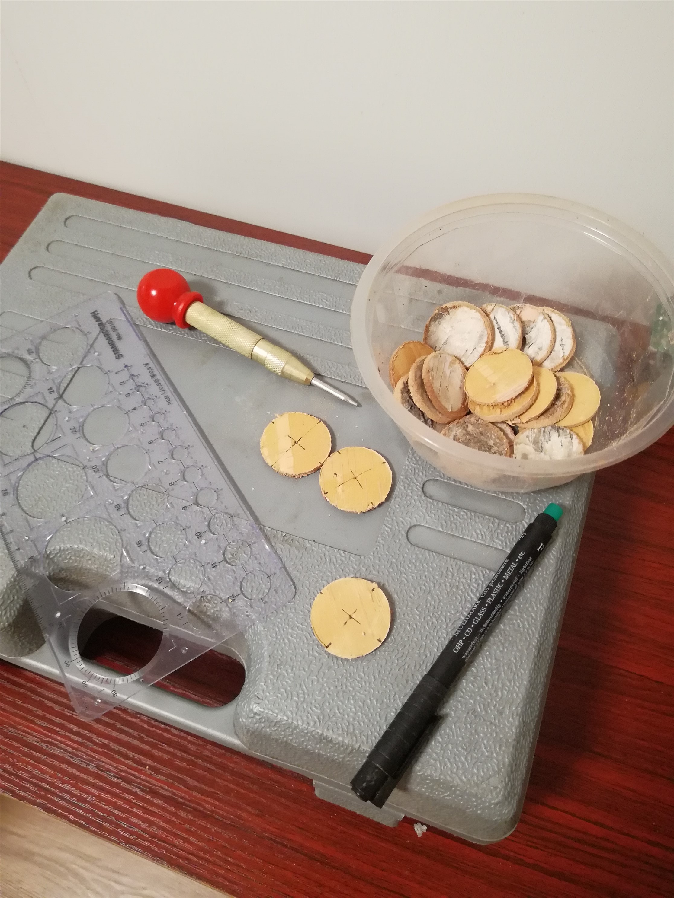 So, gerade mal etwas probiert. Ich muss eh jede Scheibe noch mal in die Hand nehmen, da kann ich auch das Loch in der Mitte dann reinmachen.