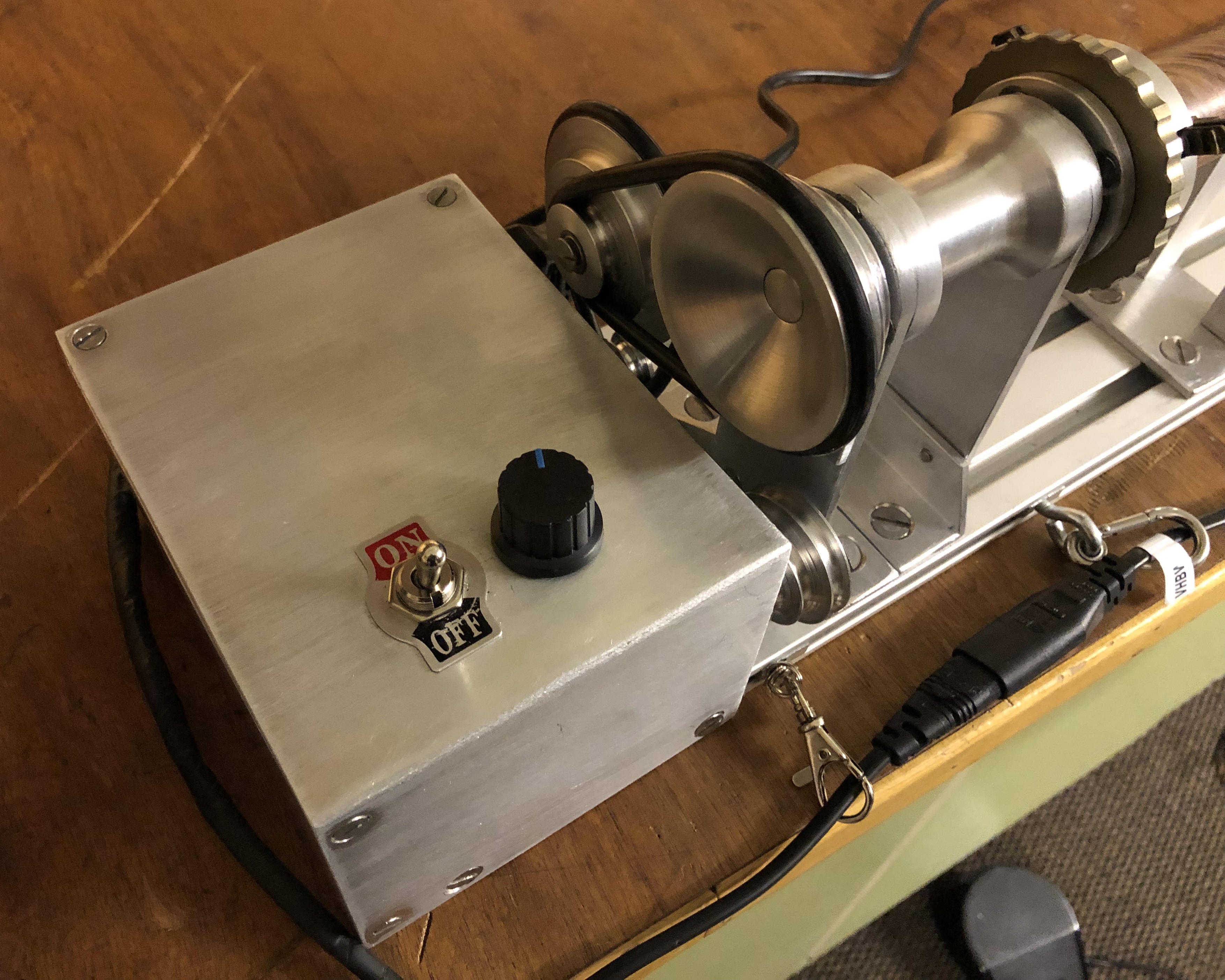 Los geht’s, die zwei Motoren-Nähmaschinen und langsamdrehenden getriebemotor zum trocknen mit 15 U/min. von früheren kauf lagen im Keller, Reststücke Alu rund-vollmaterial 40-60 mm rund ersteigert und gedreht-dreibackenfutter auch in bucht ersteigert..