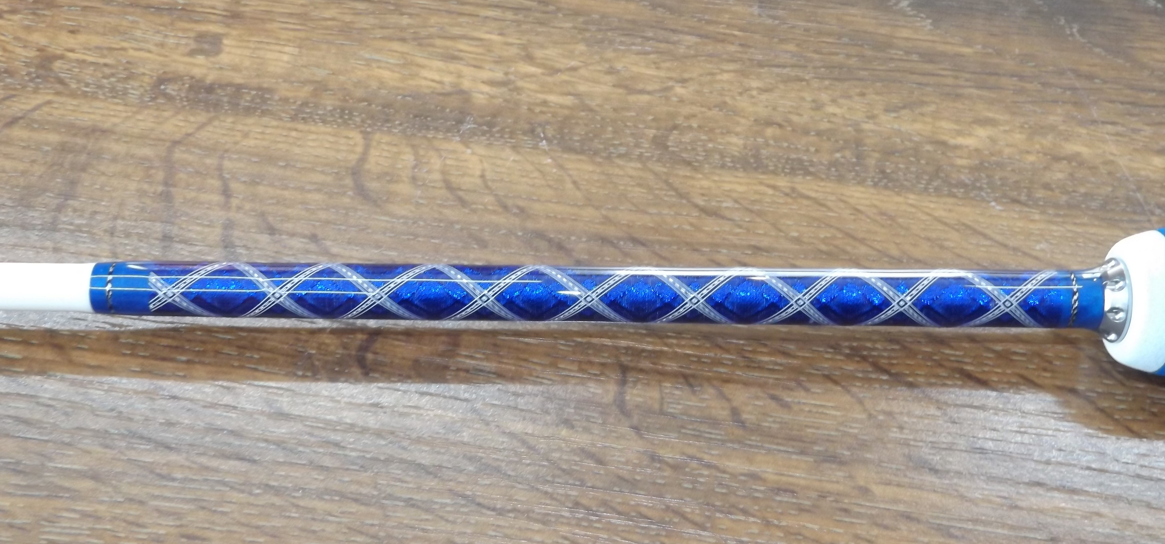 Der Griff wurde aus weißem, grauem und blauem Duplon in verschiedenen Blöcken zusammen gesetzt, verklebt und dann in Form gebohrt & geschliffen, so dass diese schönen Muster entstanden! Daumenhoch3