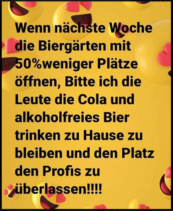 Huahaha, ja wer sich mit Cola und Zeug in einen echten Biergarten hockt, der kann auch gleich zuhause bleiben...