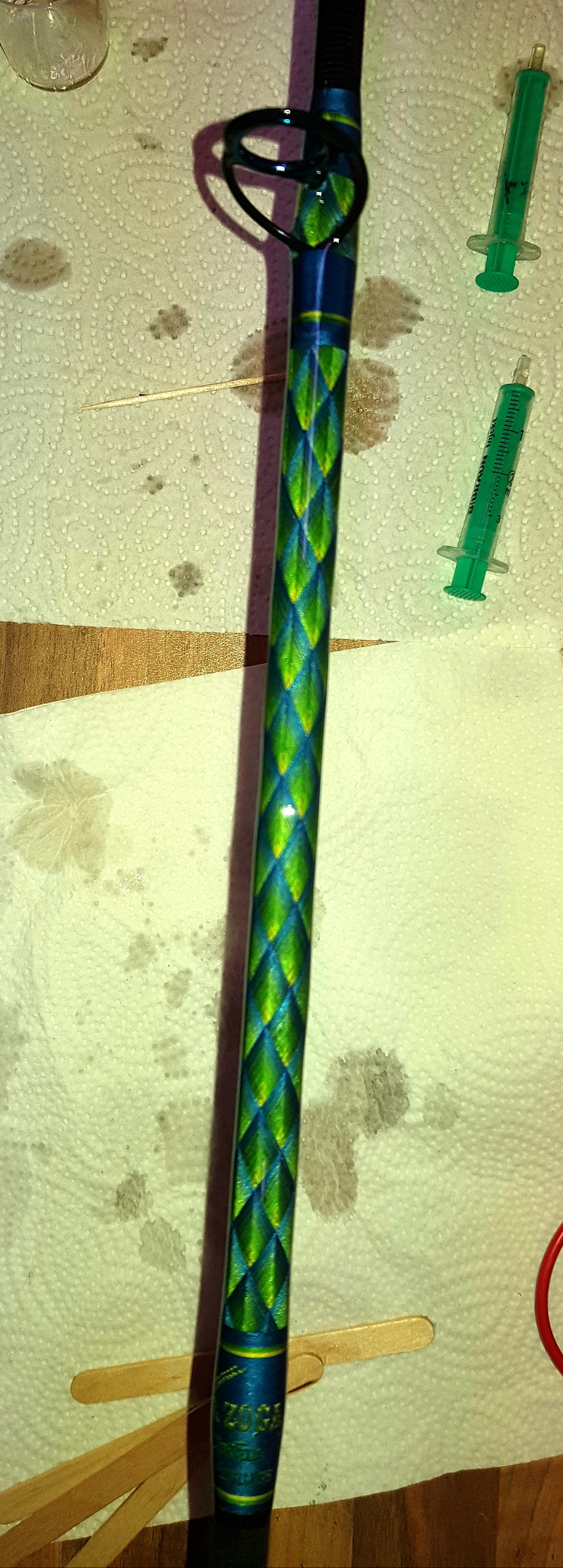 da Corona dafür sorgt, dass ich ein bisschen mehr Zeit diese Frühjahr habe, hab ich das nächste Winterprojekt vorgezogen. Es soll eine vertkale Wallerrute fürs Kajak werden und ggf. auch mal ein Einsatz in Norwegen bekommen. Inspiriert ist sie vom Fisch Mahi mahi und von einer Rute von Billy Vivona.