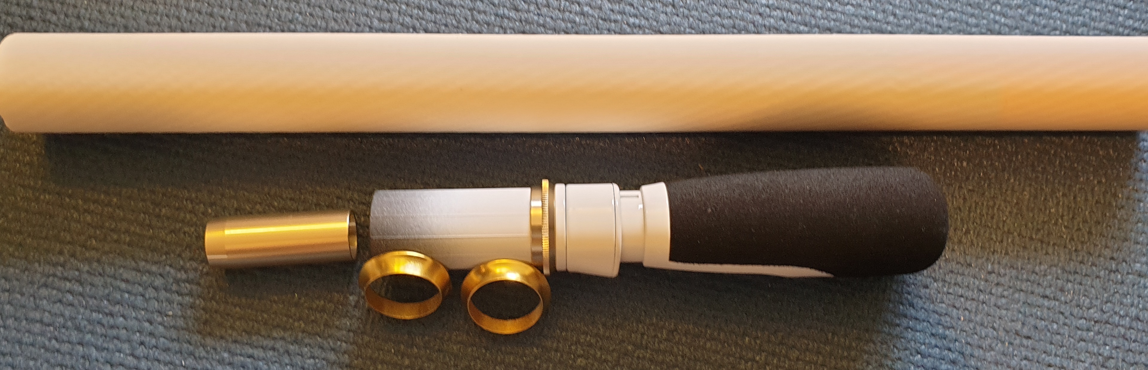 Alles in allem ist es etwa optisch das geworden, was ich mir vorgestellt hab. Der Split Grip wirkt massiver als ich es in meinen Gedanken hatte. Aber das Elforyn hat ~ 12 mm ID und 18 mm OD - hätte man sich denken können. Damit ist das Teil ohne Ring und ohne andere Wicklung bereits schwerer als das, was Bernd hier so baut. Das Handteil liegt nun bei 130 - 135 g.